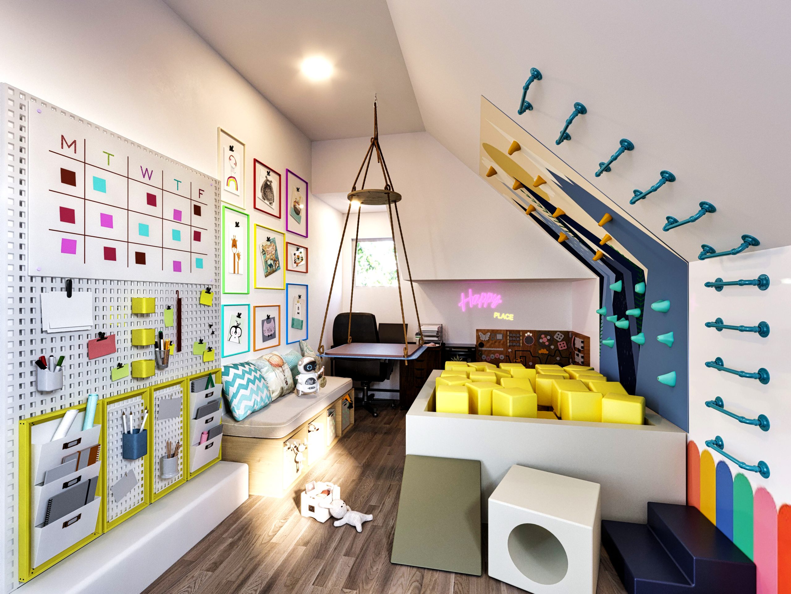 Description: “ImagiPlay Hub” is a vibrant and versatile master bedroom transformation. It creates an exciting play area for kids, featuring activity boards, a soft carpet, a foam pit, climbing panels, and monkey bars for physical development and imaginative play. The room maintains a functional office corner and a rotating art station. A platform swing adds sensory fun. “ImagiPlay Hub” offers a playful oasis for kids while accommodating practical needs.