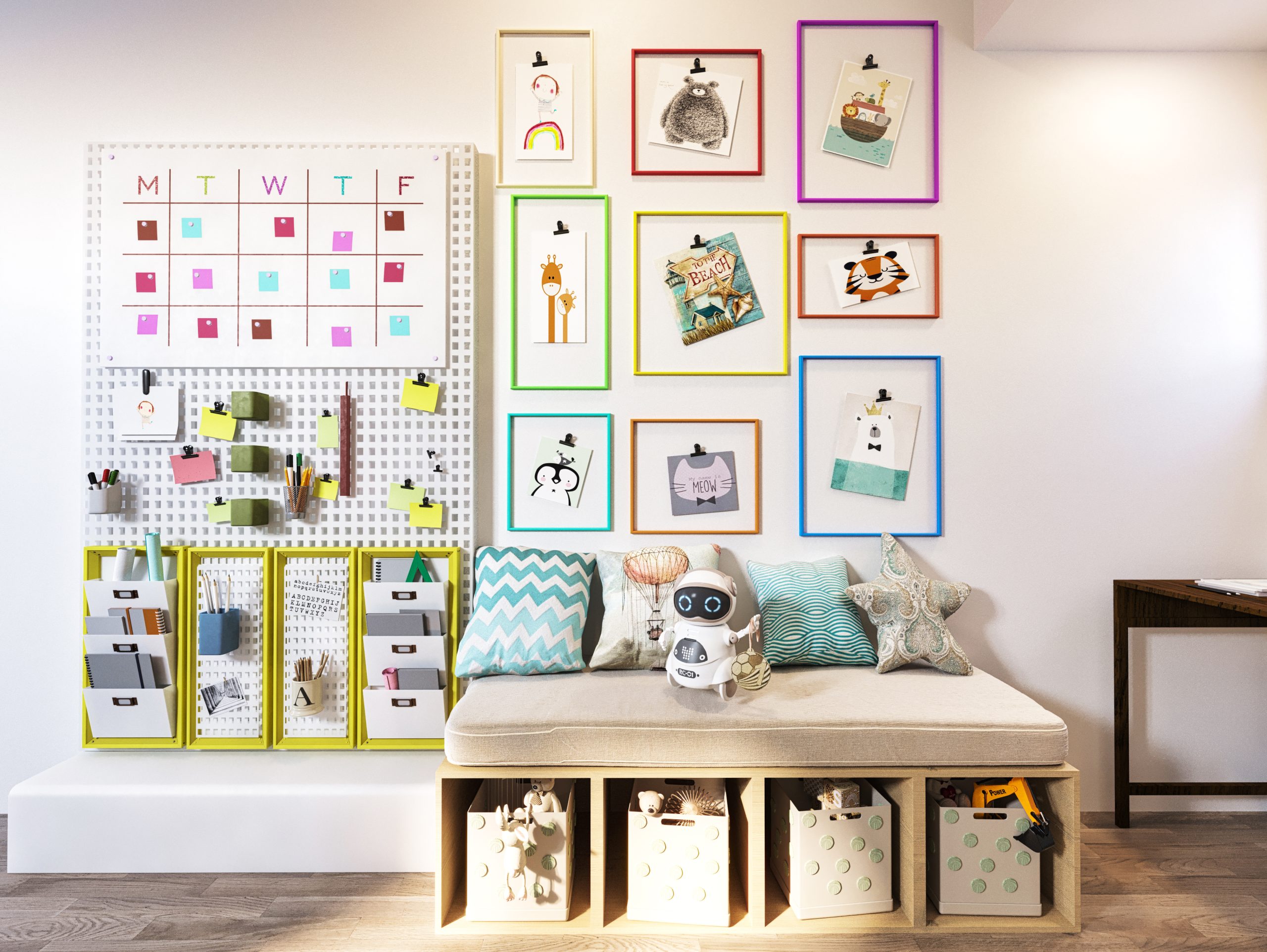 An art station has been designed with a rotating art show on the wall, allowing them to regularly change the pictures on display. A pegboard has been added to save space and keep all of their child’s art and crafting tools organized. A cushioned bench with a storage basket underneath serves as a seating area for reading and a convenient storage solution.