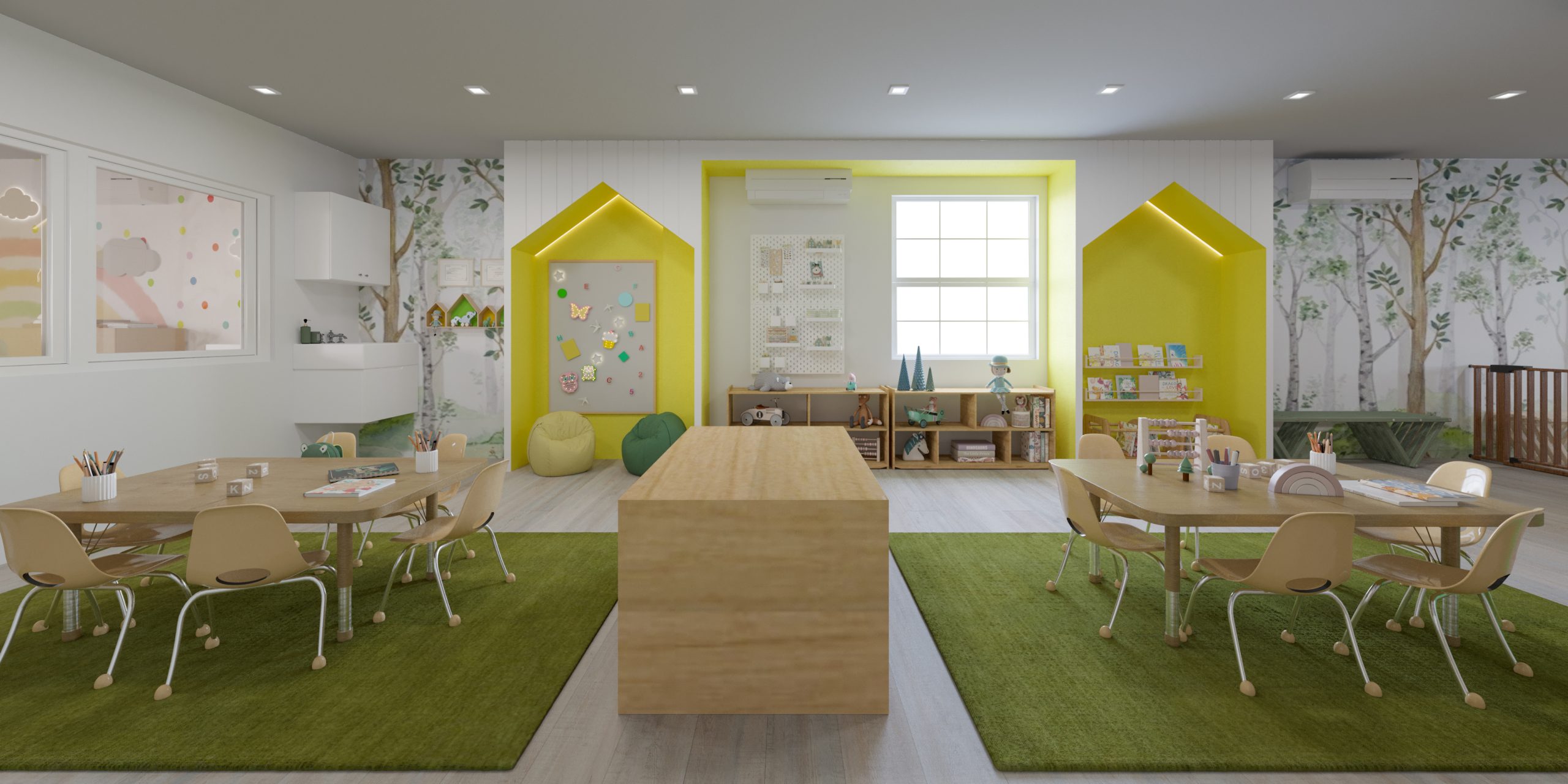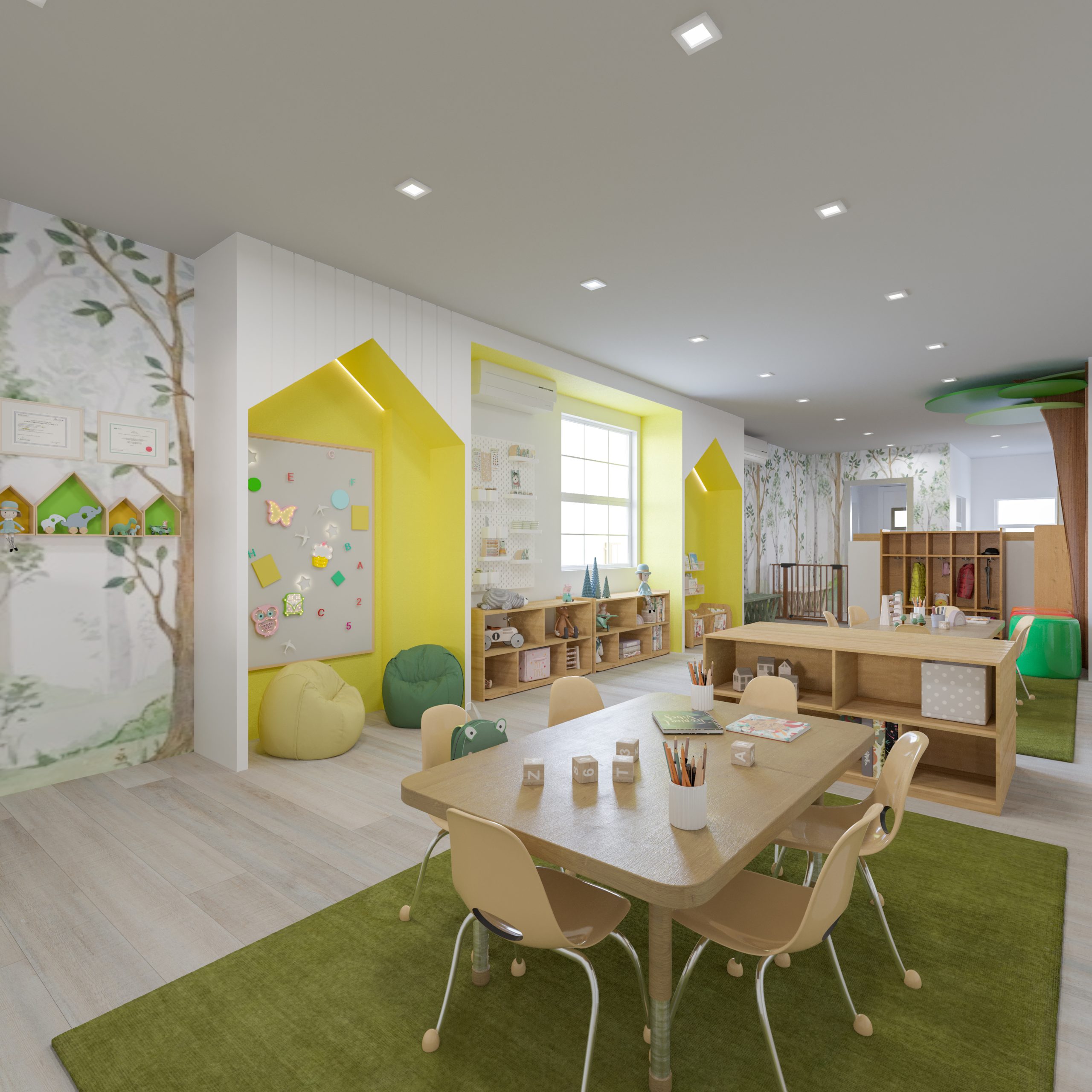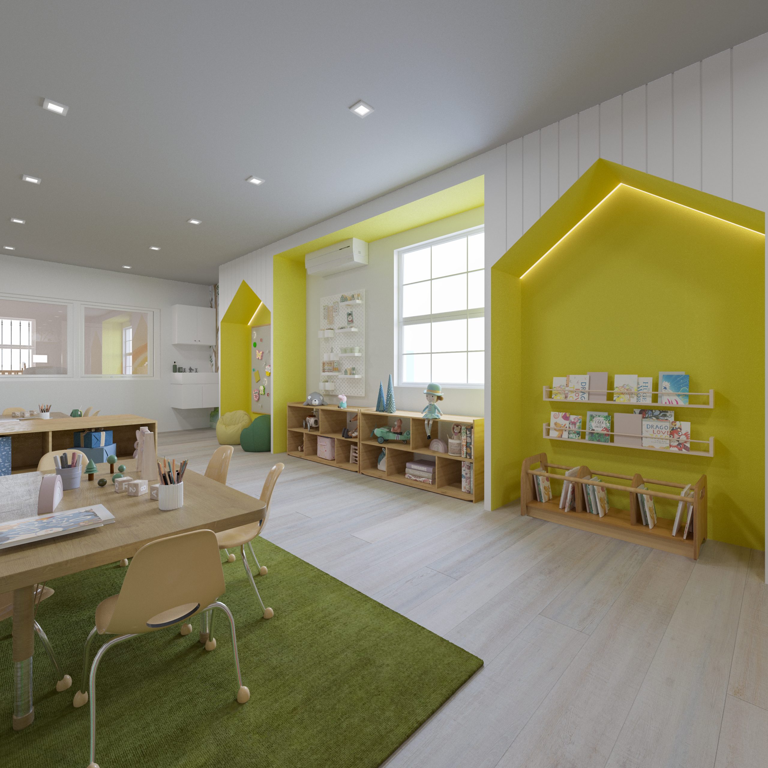 Natural light and soft lighting fixtures enhance the sense of openness, creating a bright and airy environment that feels both welcoming and lively. The design also integrates educational and playful decor elements that stimulate curiosity and support the center’s mission of holistic growth and development.