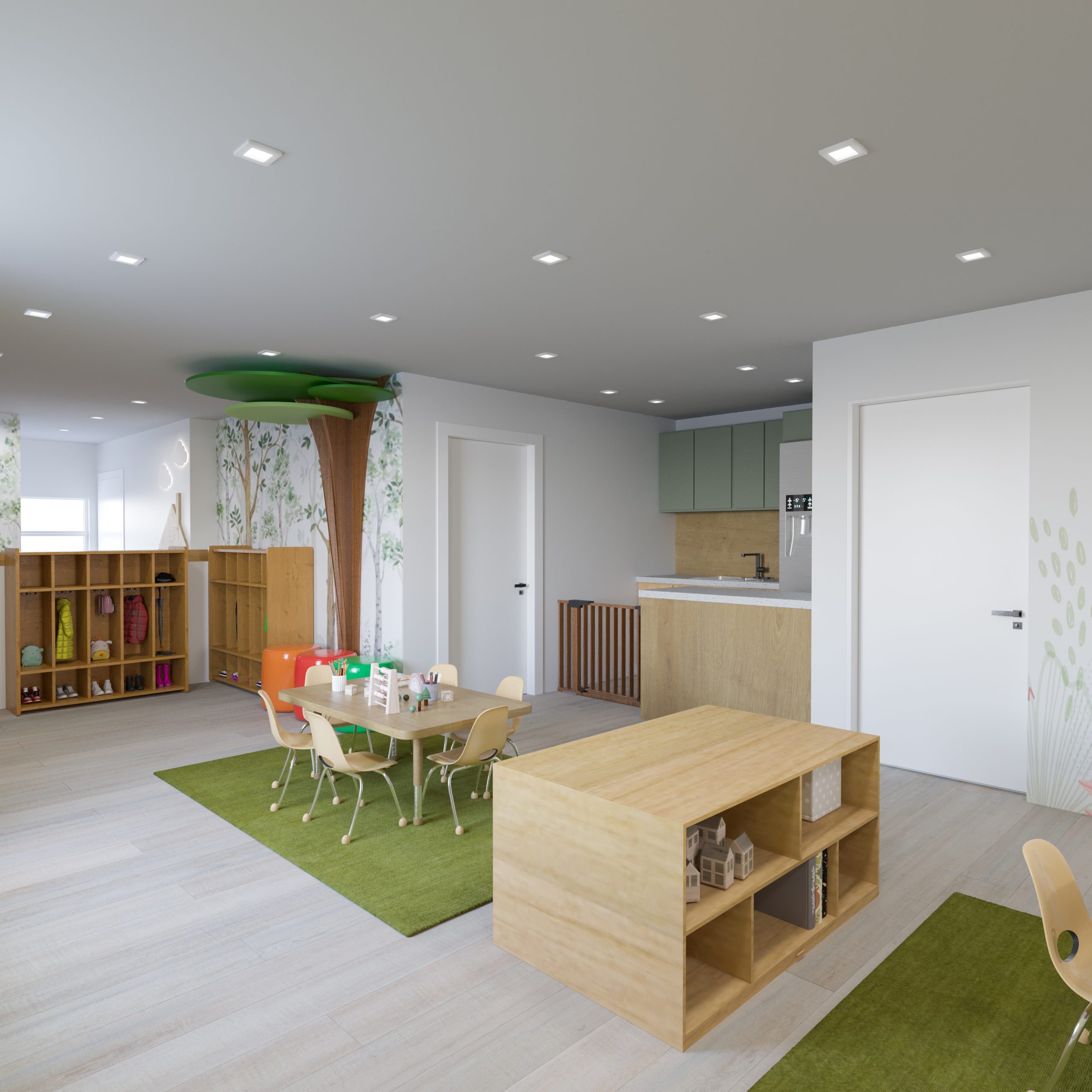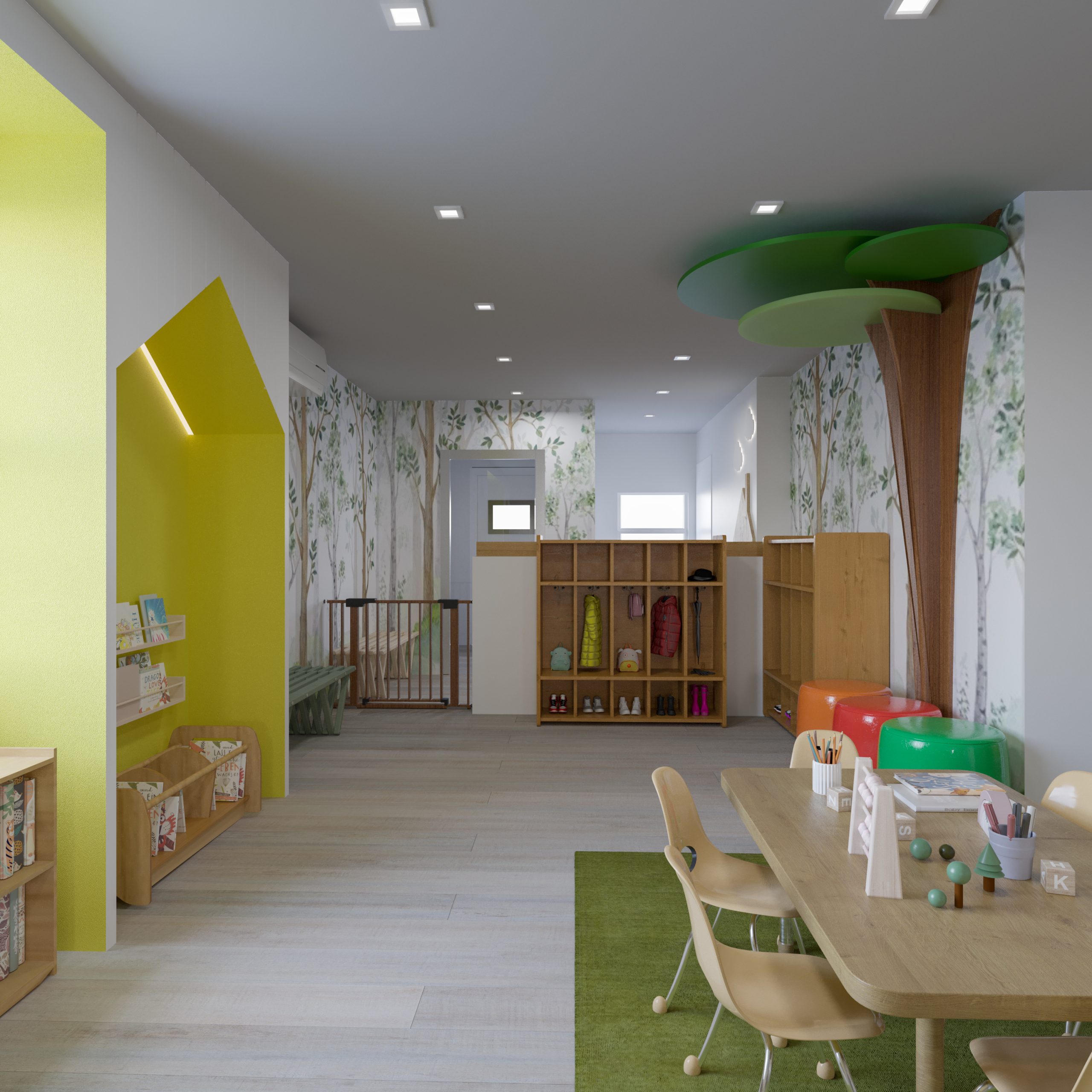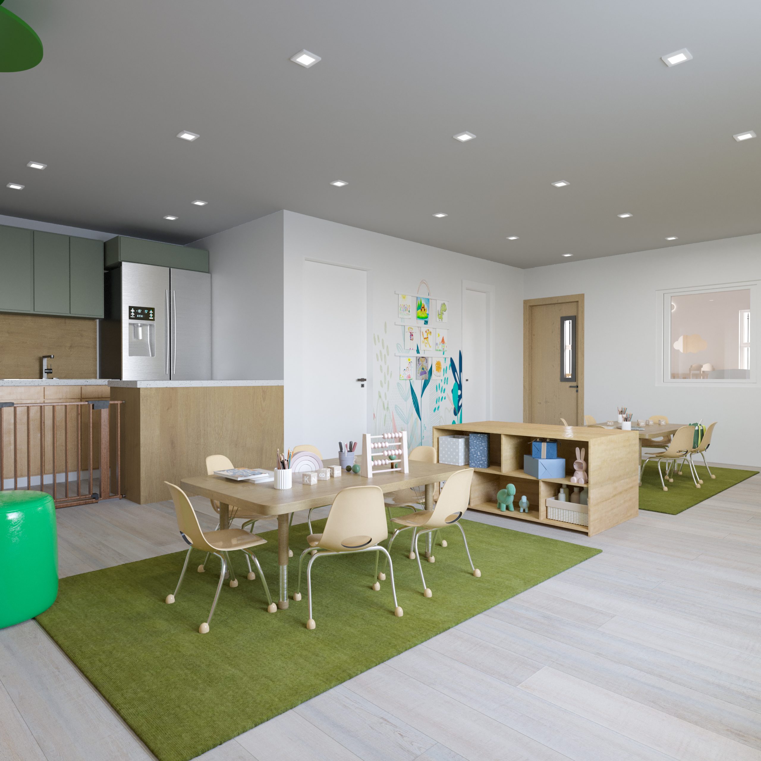 Natural light and soft lighting fixtures enhance the sense of openness, creating a bright and airy environment that feels both welcoming and lively. The design also integrates educational and playful decor elements that stimulate curiosity and support the center’s mission of holistic growth and development.