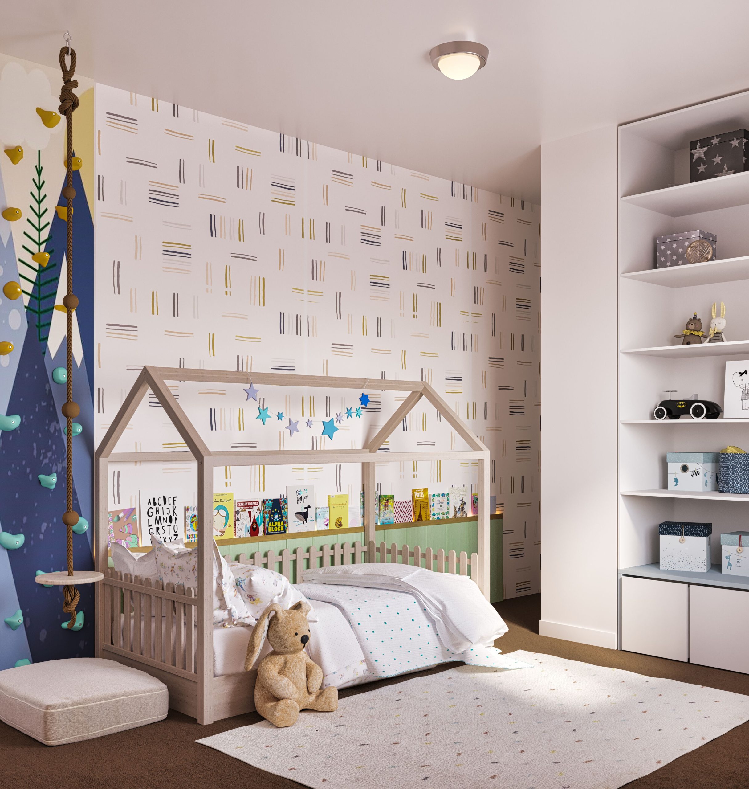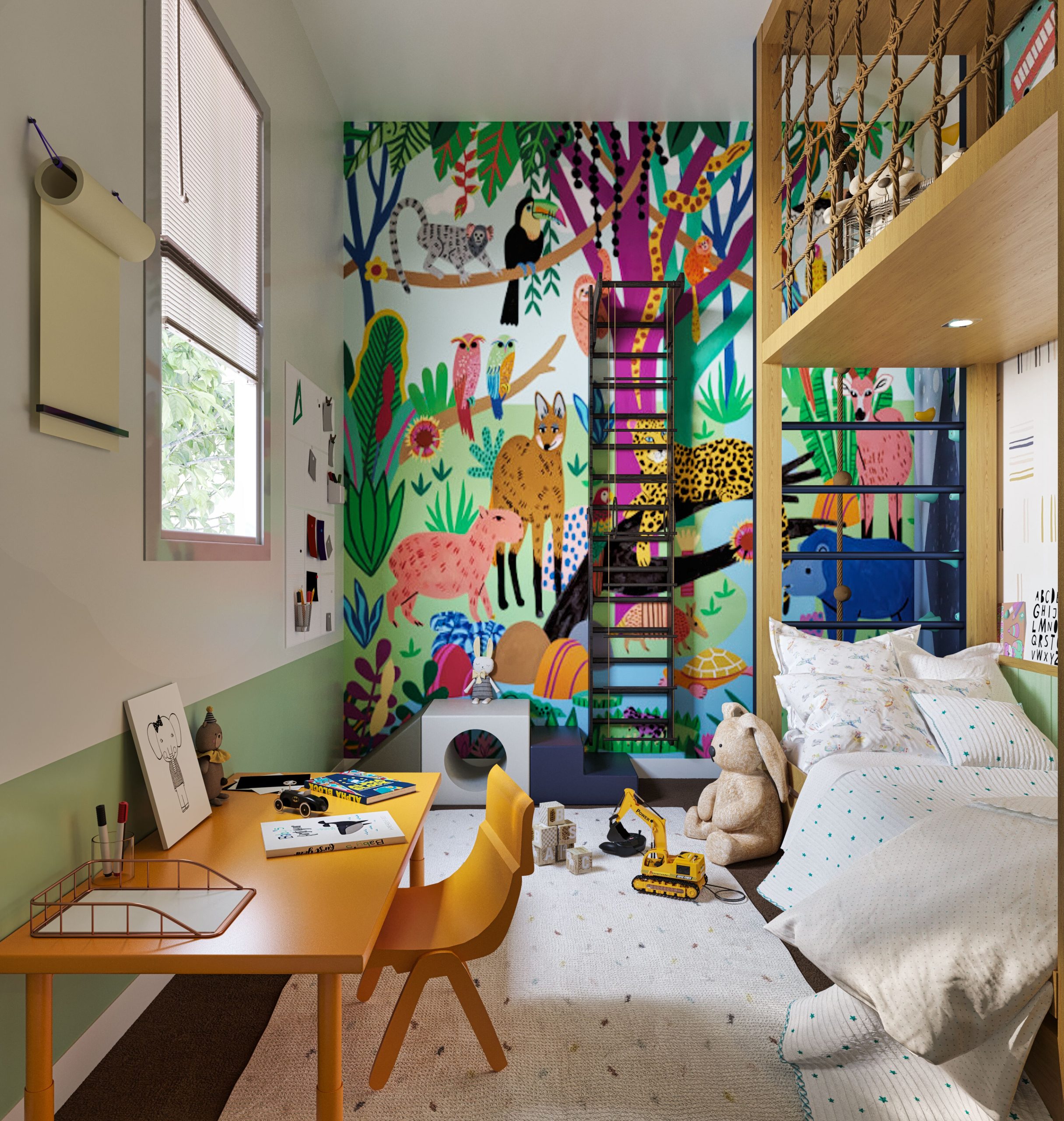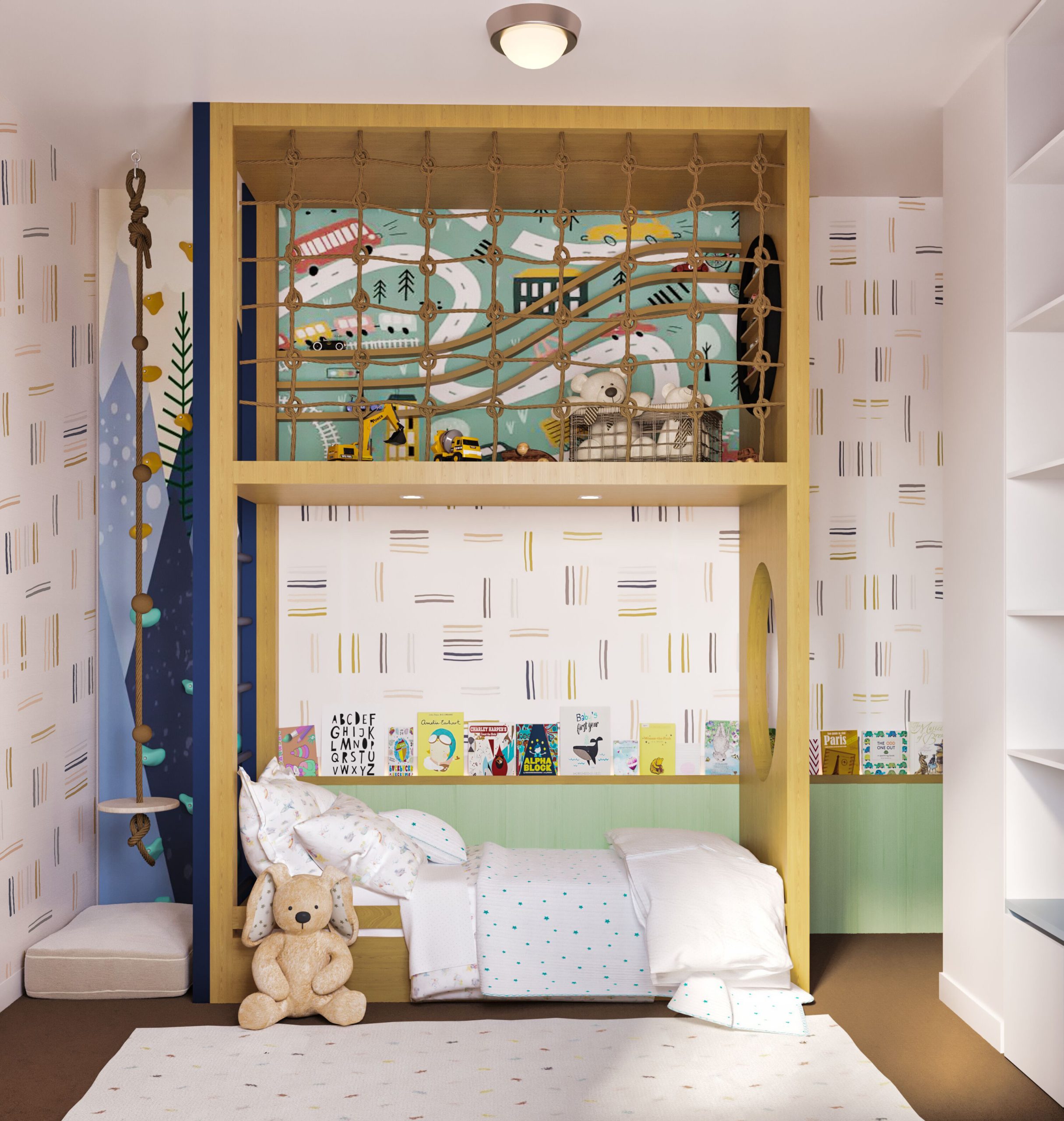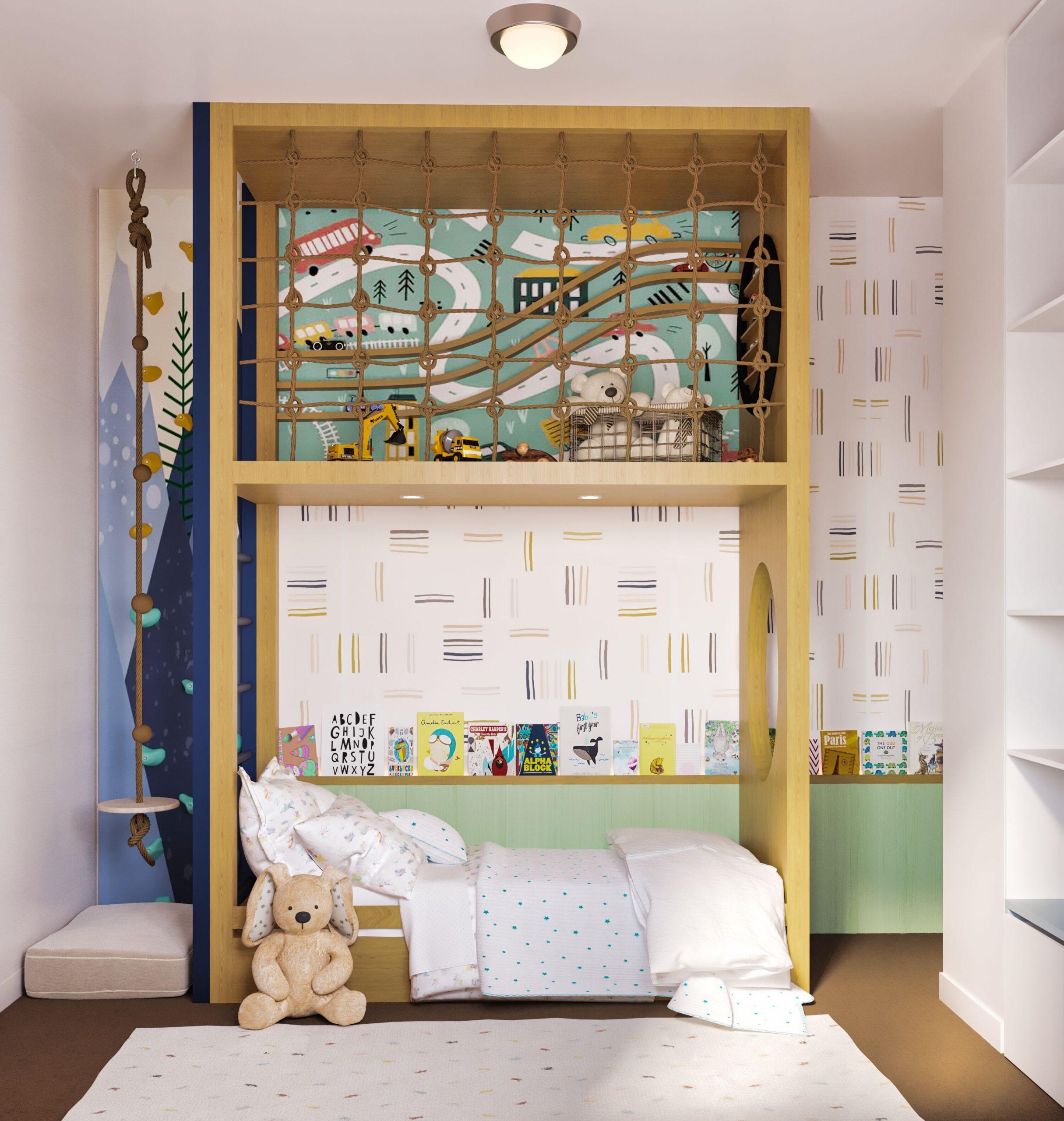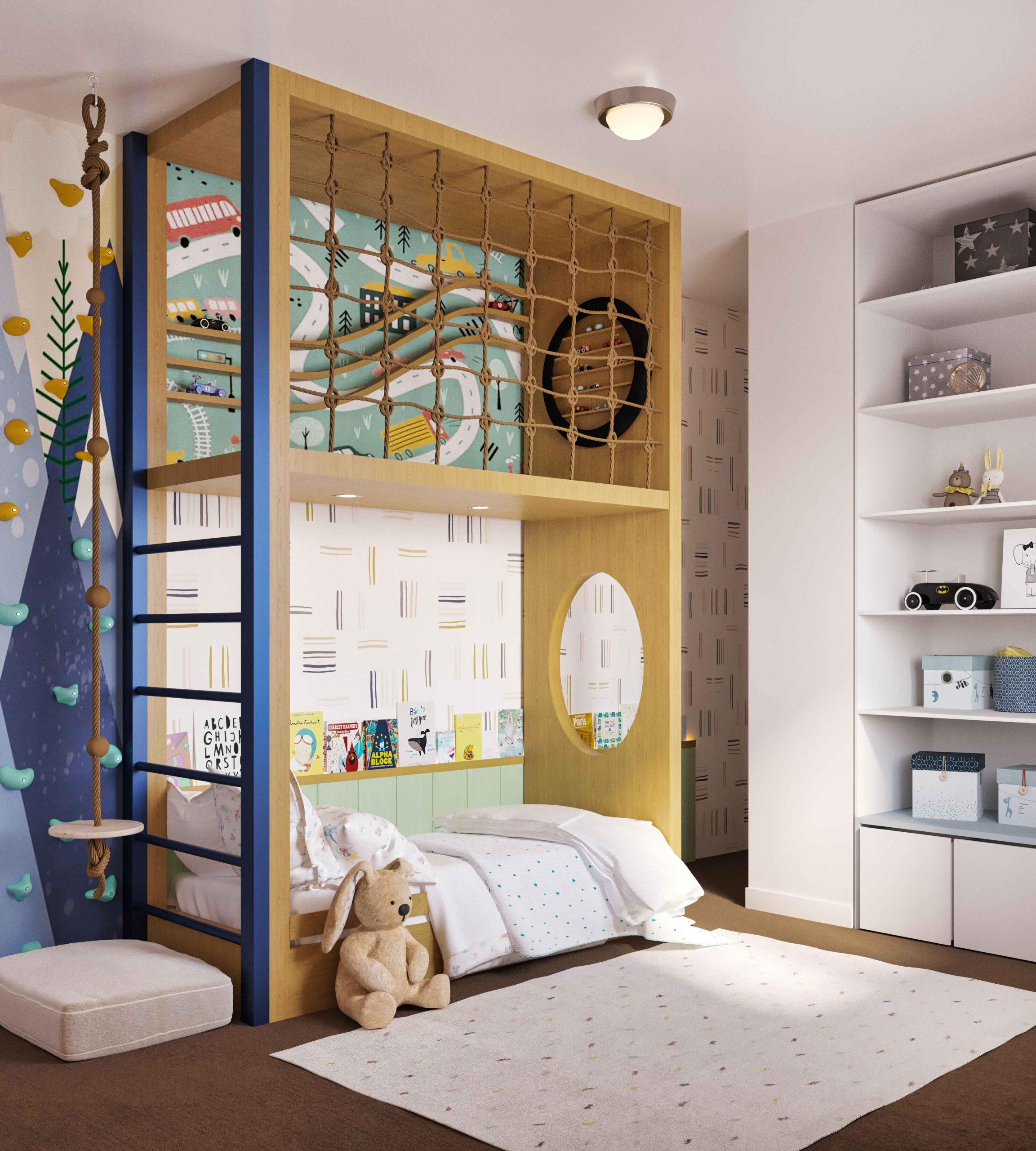 In addition to the two-level bed with the upper level dedicated to playing, I propose incorporating climbing panels and a Swedish leader into the room’s design. Climbing panels and a Swedish leader encourage their child to play actively, promoting strength, coordination, and confidence. These elements provide an opportunity for physical exercise and development and add an exciting and unique feature to the room’s design.