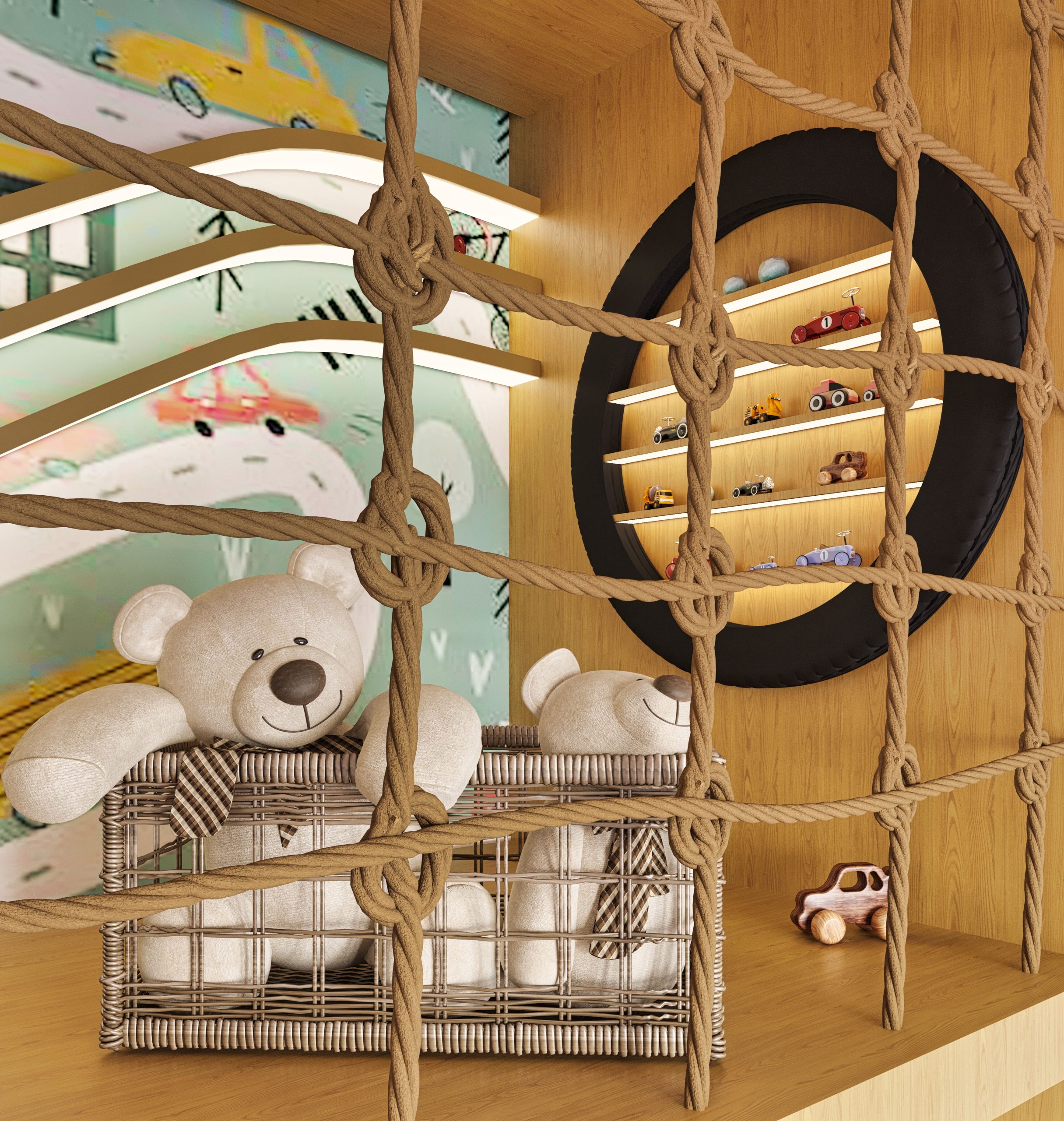 Description: “ImagiCars Loft” is an imaginative and secure interior design project for children’s rooms. It showcases a two-level bed with an upper play area, mini-cars, and safety guardrails. The design incorporates climbing panels, a Swedish ladder, and an art station to encourage physical activity and creative development. A squishy-shaped floor mat ensures a safe and playful playtime experience. “ImagiCars Loft” offers a captivating space where children can explore their imagination and have endless fun.