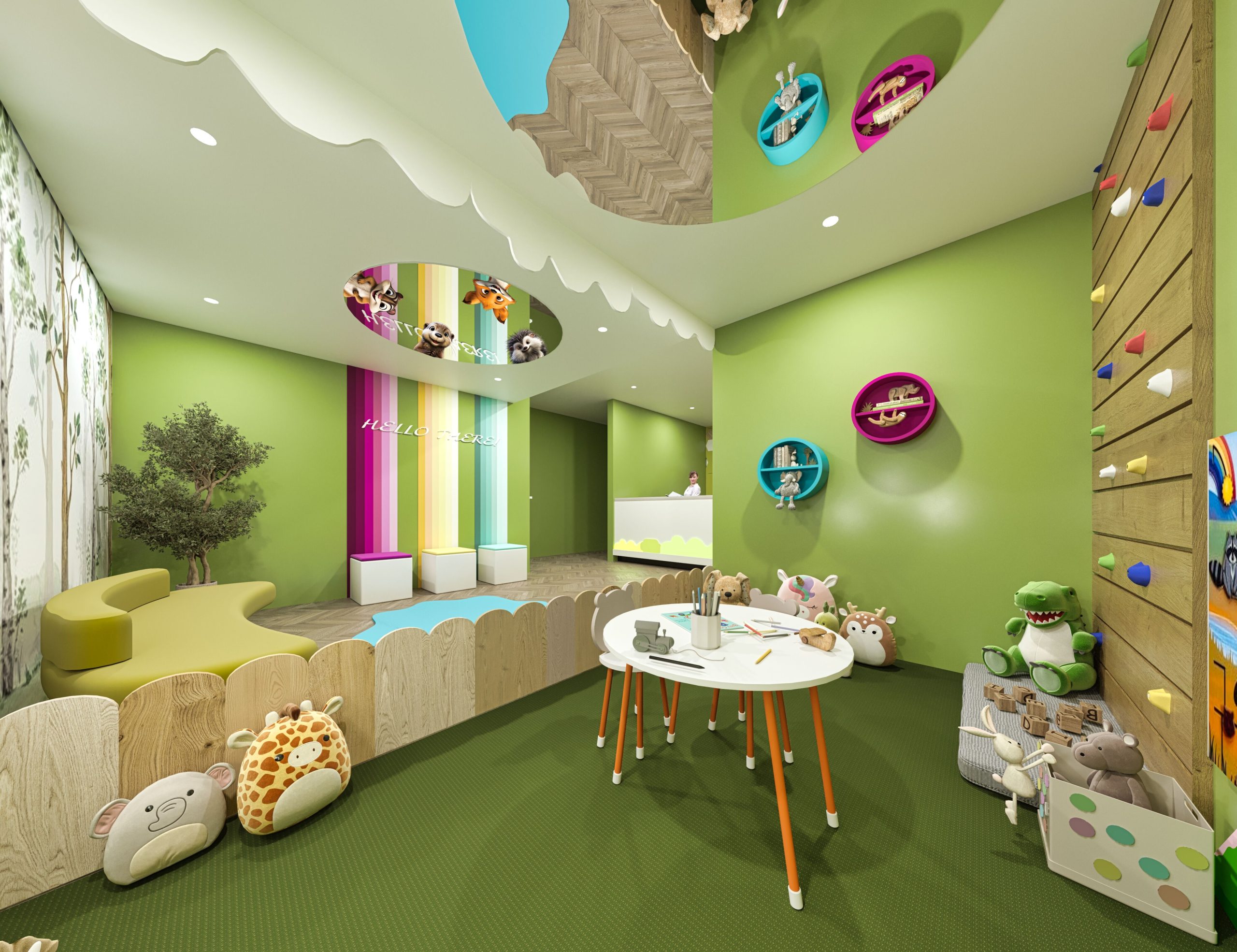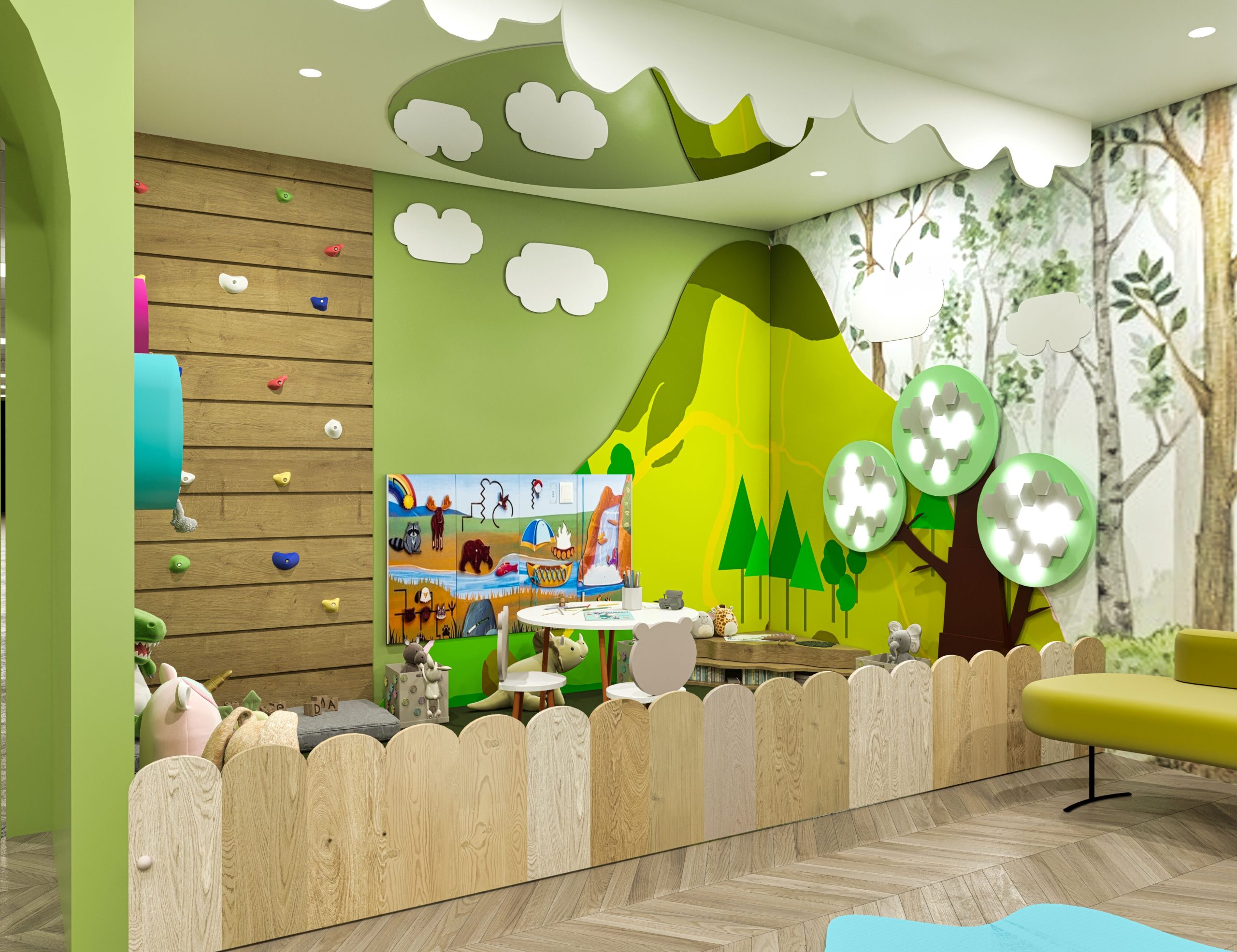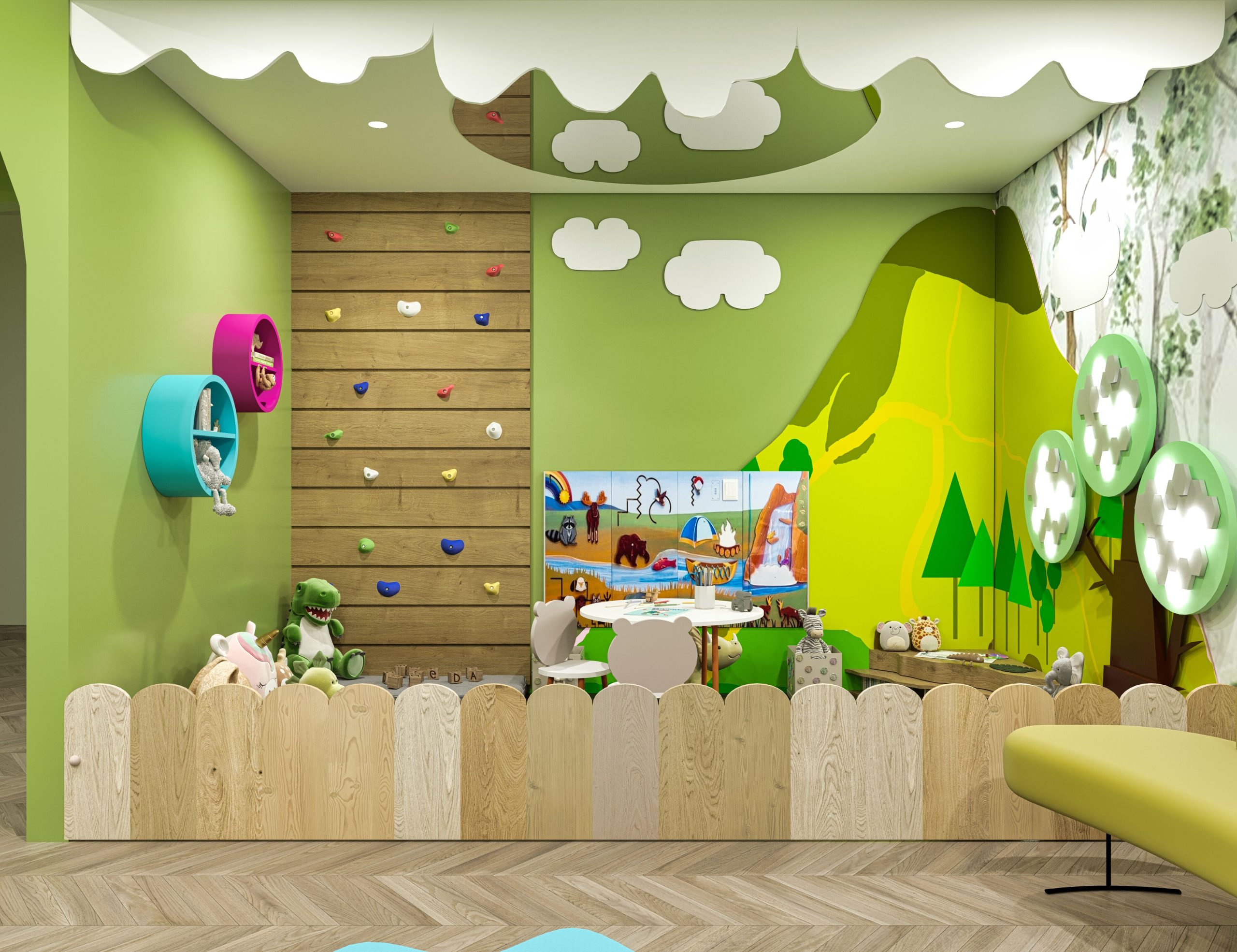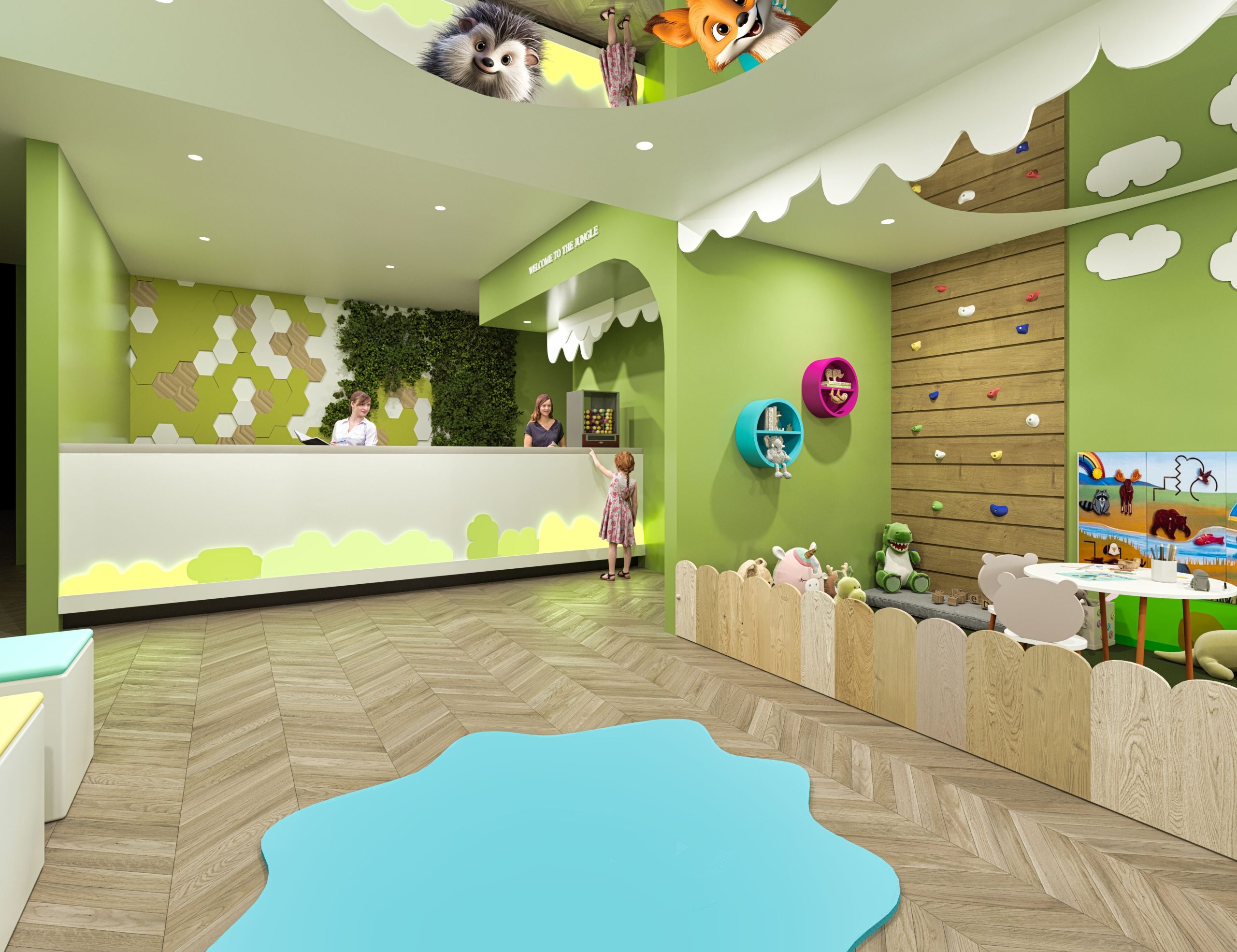The waiting area invites children to step into an imaginative world filled with animal motifs, foliage-inspired wall graphics, and carefully placed jungle-themed decor. Soft seating areas are arranged to resemble natural clearings, providing a calming atmosphere for both parents and kids. Elements like tree-shaped partitions and vine-inspired wall details offer subtle spatial division while enhancing the jungle aesthetic.