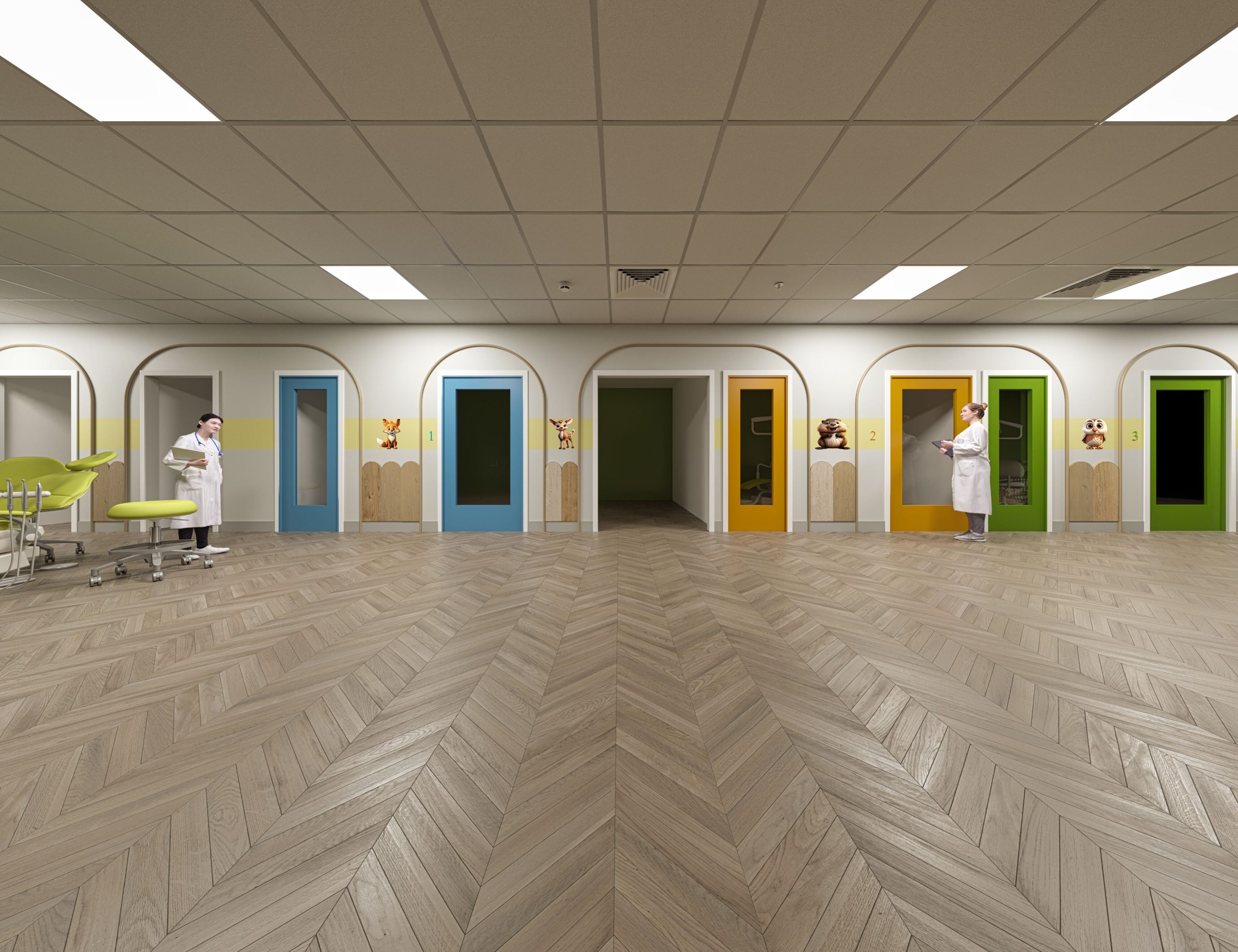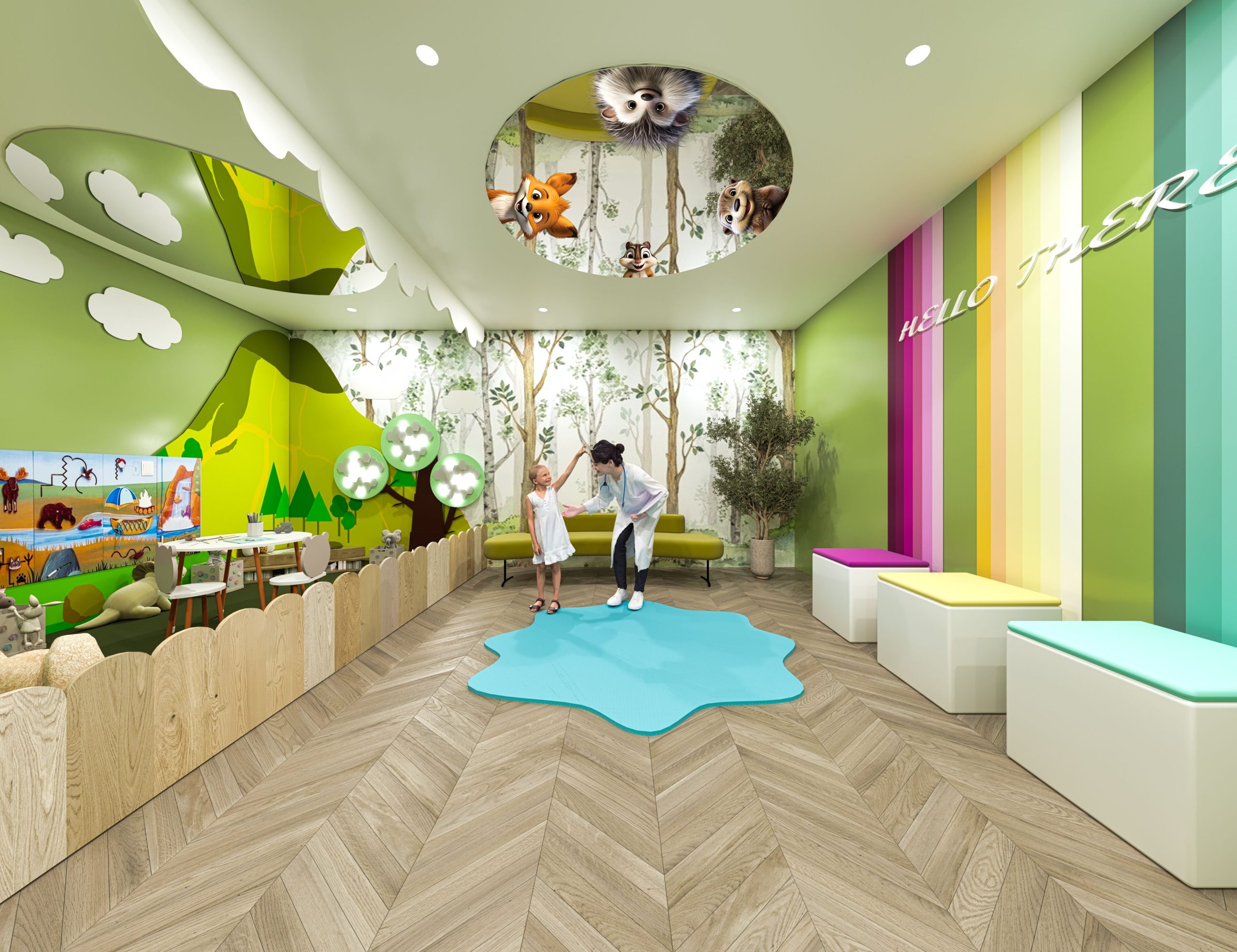 In the treatment rooms, gentle, nature-themed visuals help create a soothing environment. Each room is designed to minimize stress for children, integrating visual distractions like rainforest murals, ceiling mobiles, and built-in screens playing gentle jungle sounds or animations. The furniture and fixtures are selected for both comfort and durability, with child-friendly materials that ensure safety while adding to the theme.