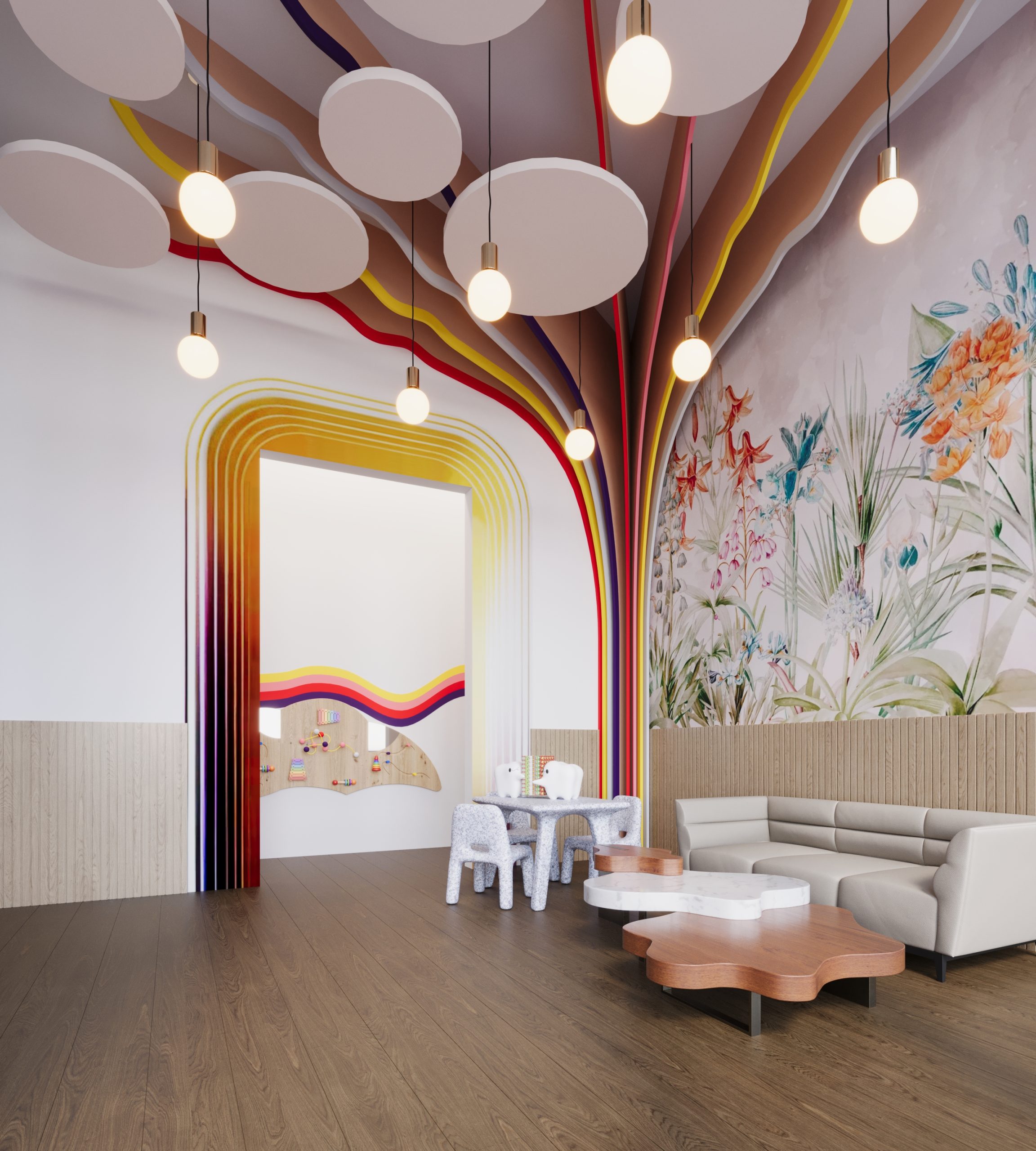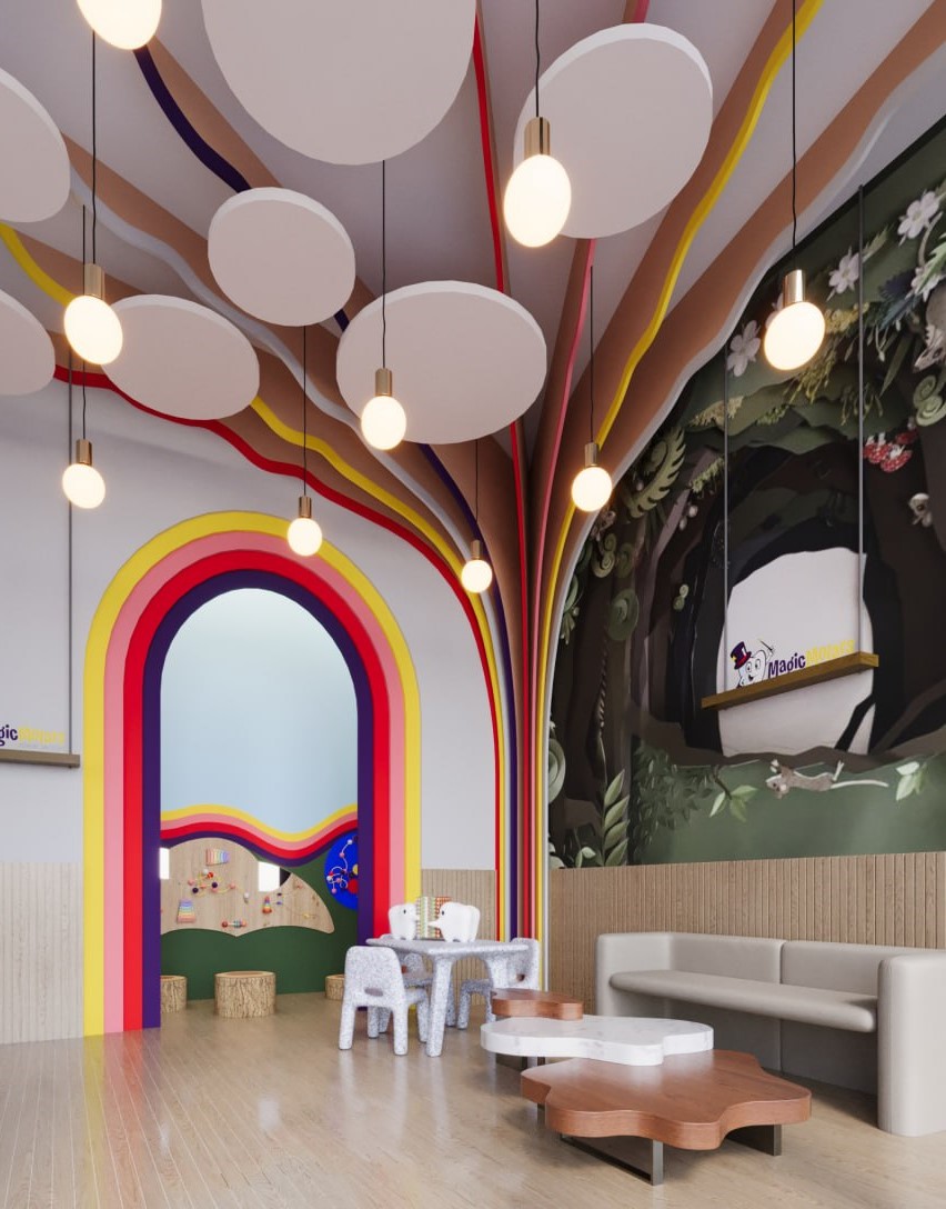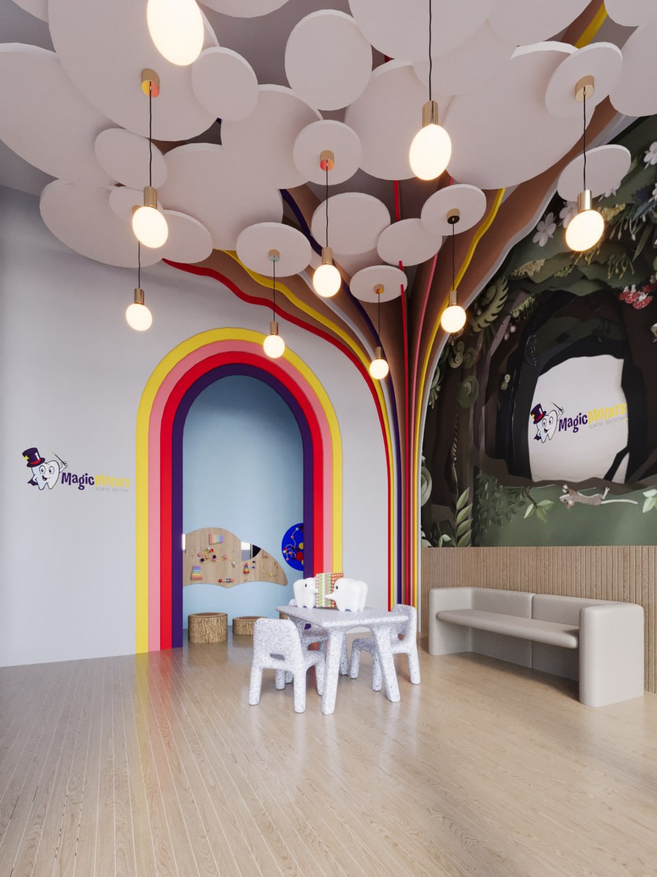 Magic Morals Dental Center is designed to transport young patients into a magical, storybook world, where each visit feels like an enchanting adventure. This whimsical dental center draws inspiration from fairy tales and enchanted forests, with gentle, magical elements that comfort and captivate children as they wait and receive care. Soft, pastel tones in shades of lavender, mint, and warm yellow create a calming yet playful ambiance throughout the space.