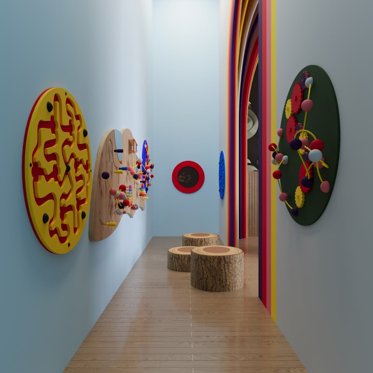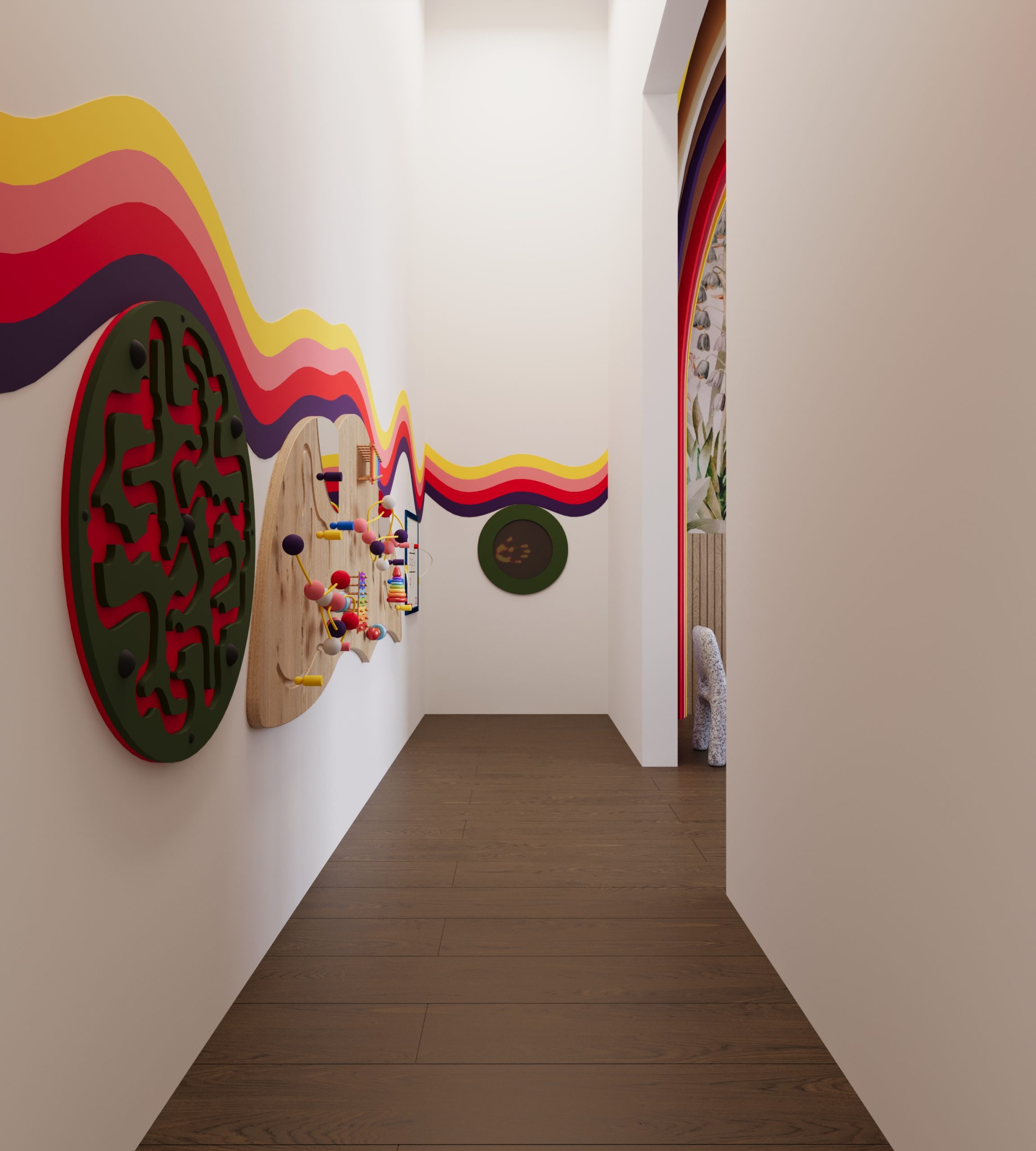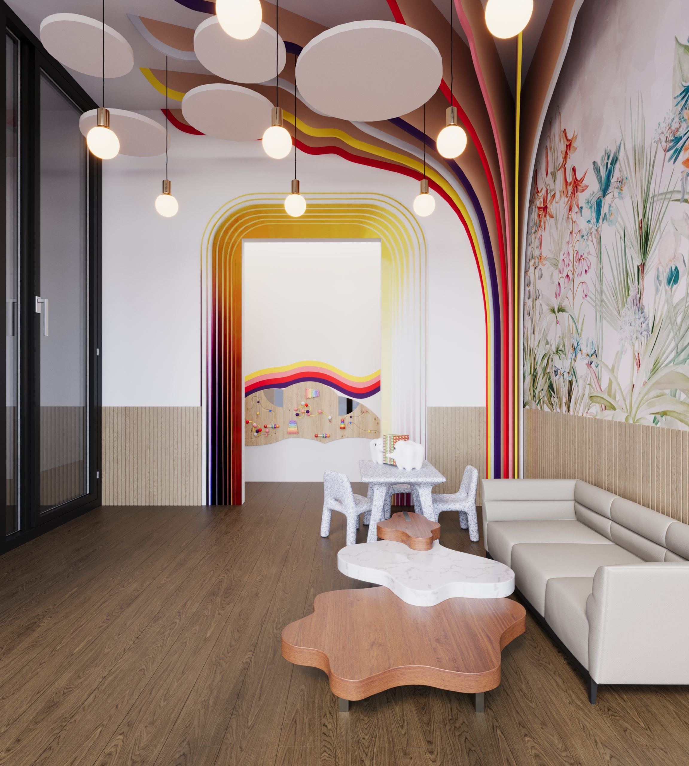 In the waiting area, the magic begins with glowing, muraled walls depicting enchanting scenes of friendly woodland creatures, sparkling stars, and whimsical castles. Carefully chosen furnishings, such as mushroom-shaped stools, tree-inspired benches, and cozy nooks, invite children and parents alike to relax in an environment that feels straight out of a fairy tale. A “story wall” with books and tactile elements encourages exploration, while enchanting ceiling mobiles of soft clouds, stars, and fairies add to the dreamy atmosphere.