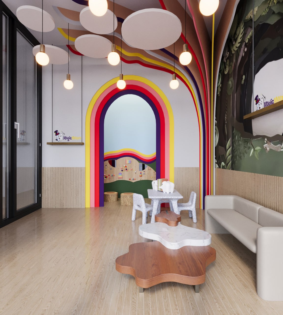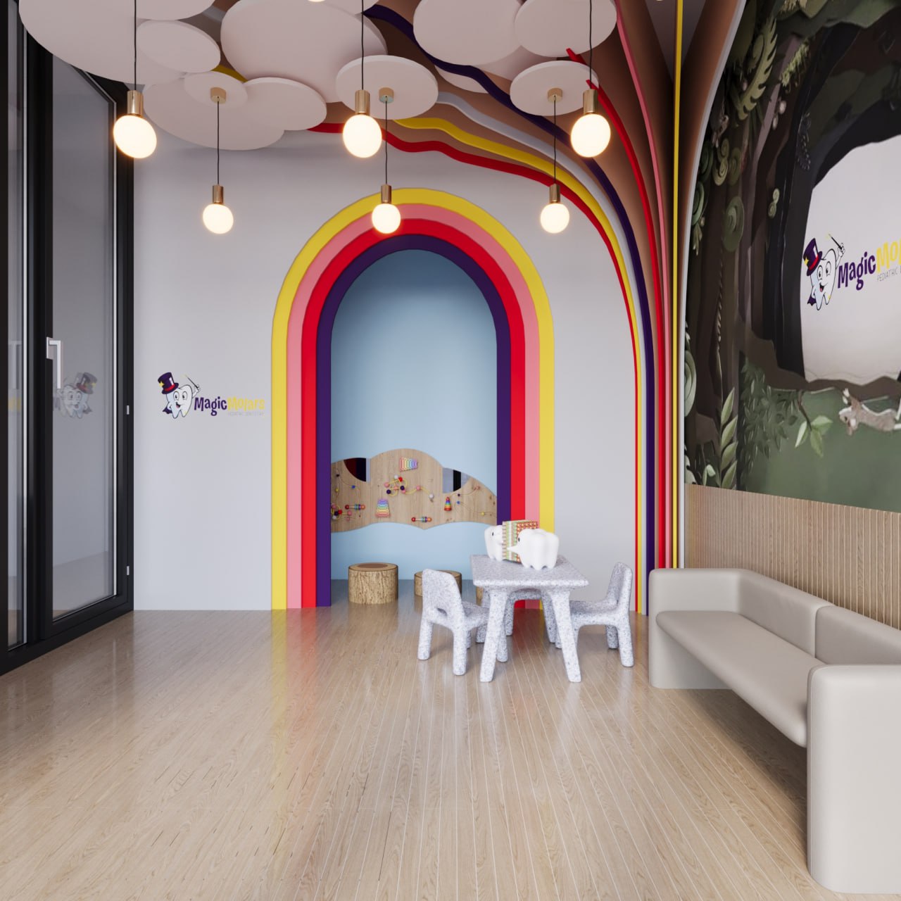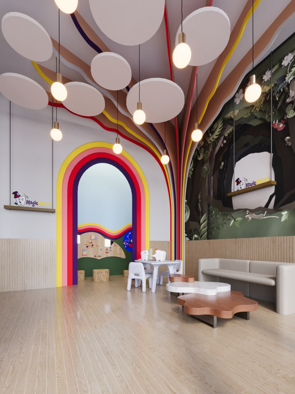 Throughout the design, special attention is given to creating a welcoming, delightful space that promotes positive feelings toward dental care. By creating an environment that feels magical, friendly, and safe, Magic Morals Dental Center ensures that each visit leaves children with bright smiles and happy memories.