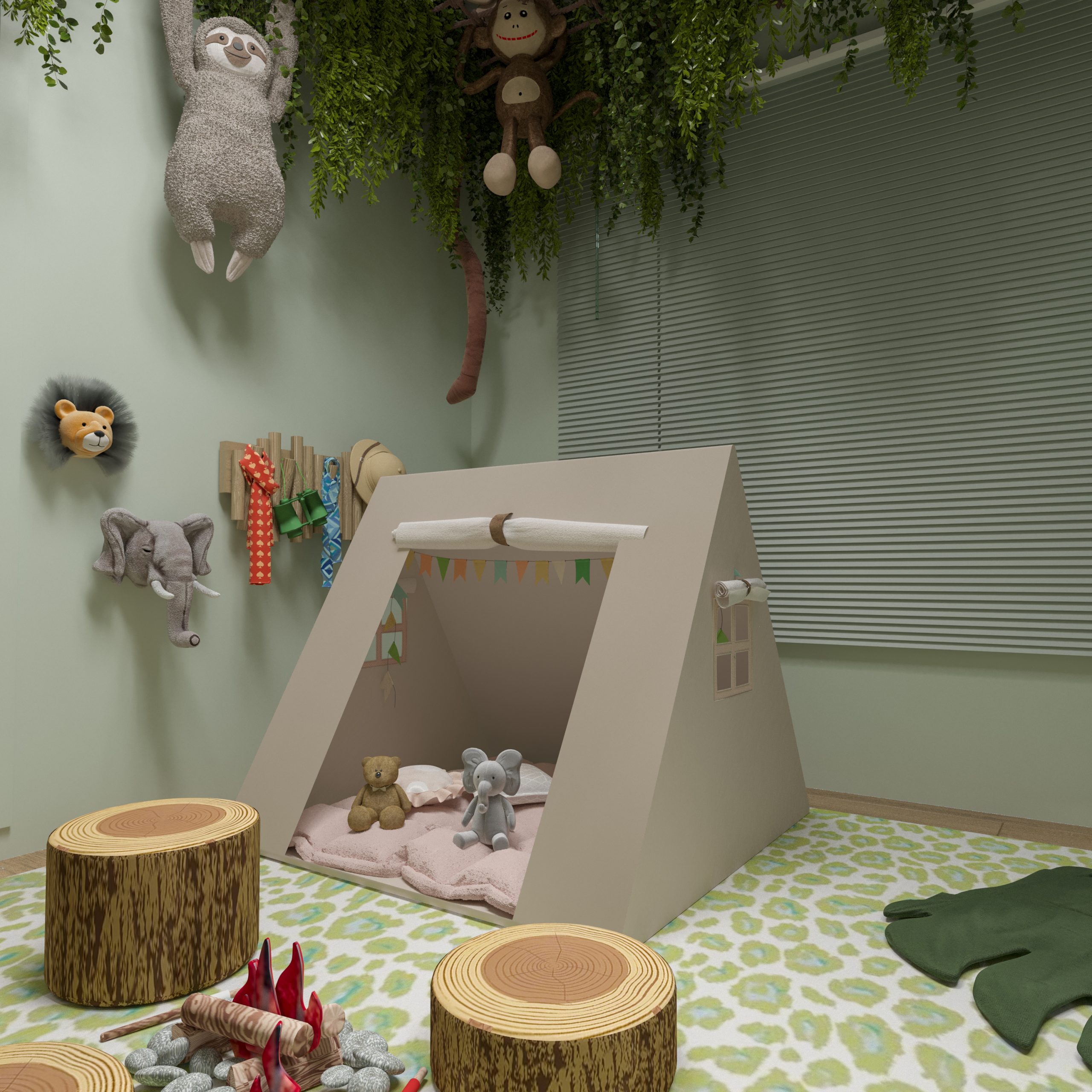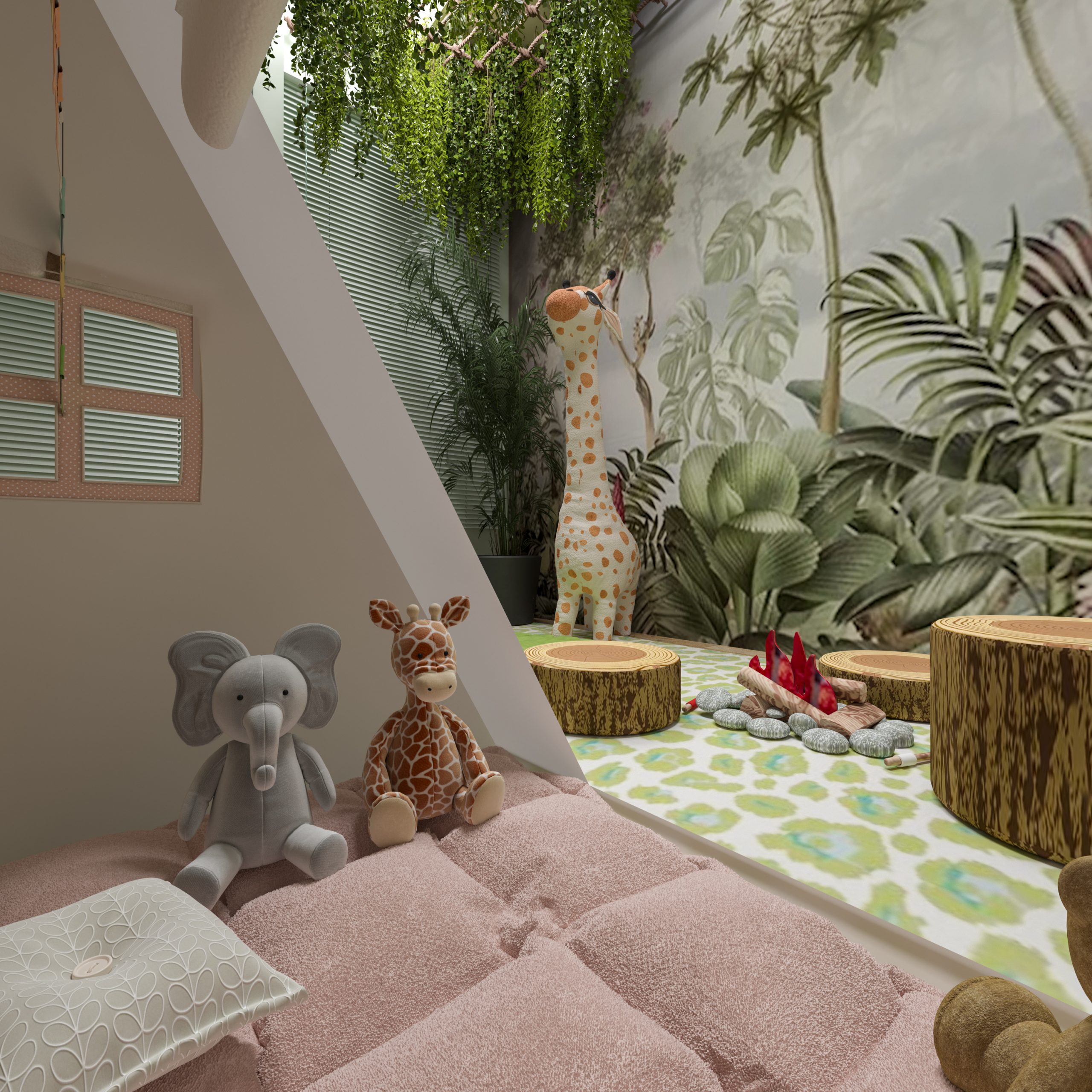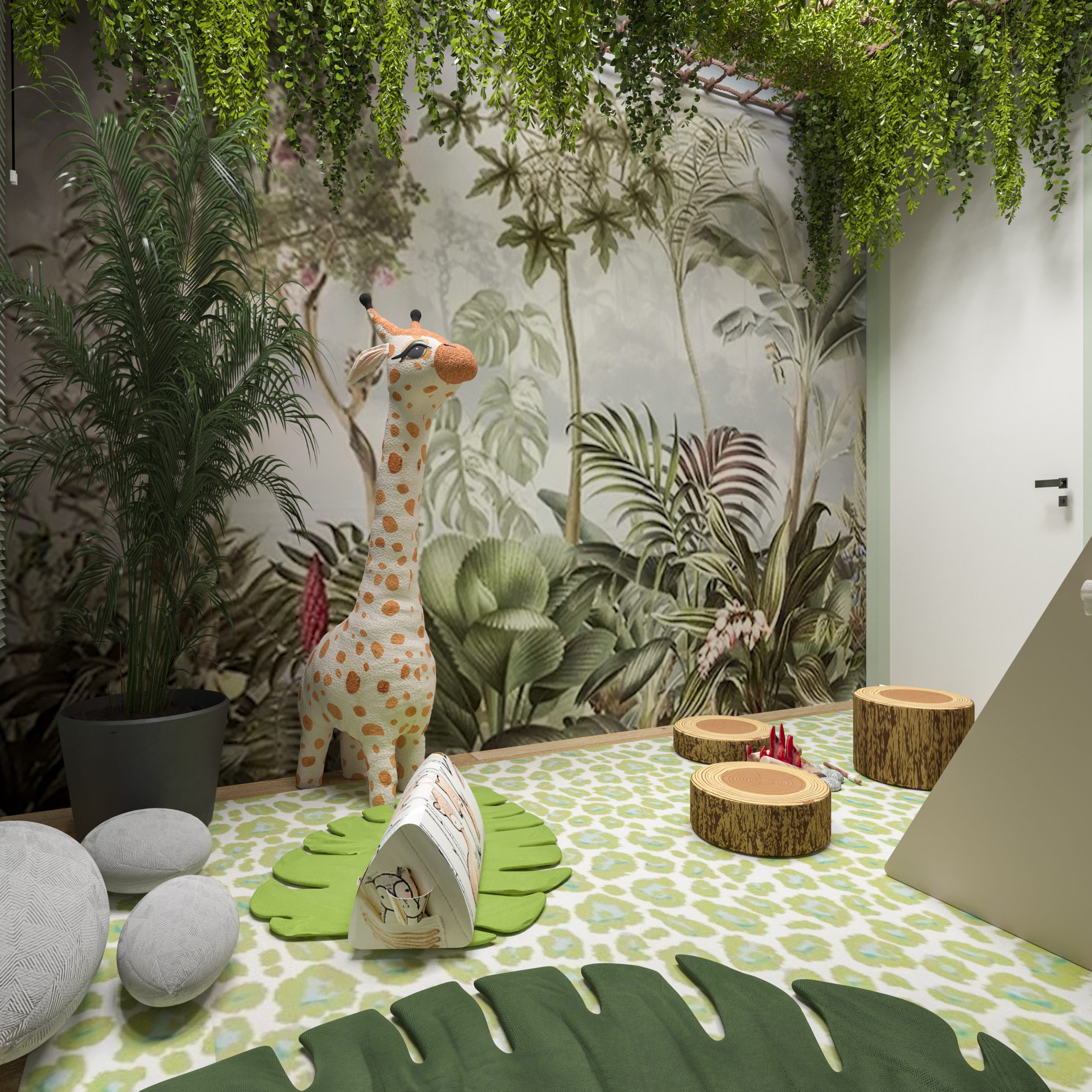 Wild Jungle Room: Nature-inspired decor, soft climbing structures, and animal-themed visuals create a sense of adventure. Textured walls and sensory-friendly materials stimulate tactile and visual senses, offering a rich, multi-sensory experience.