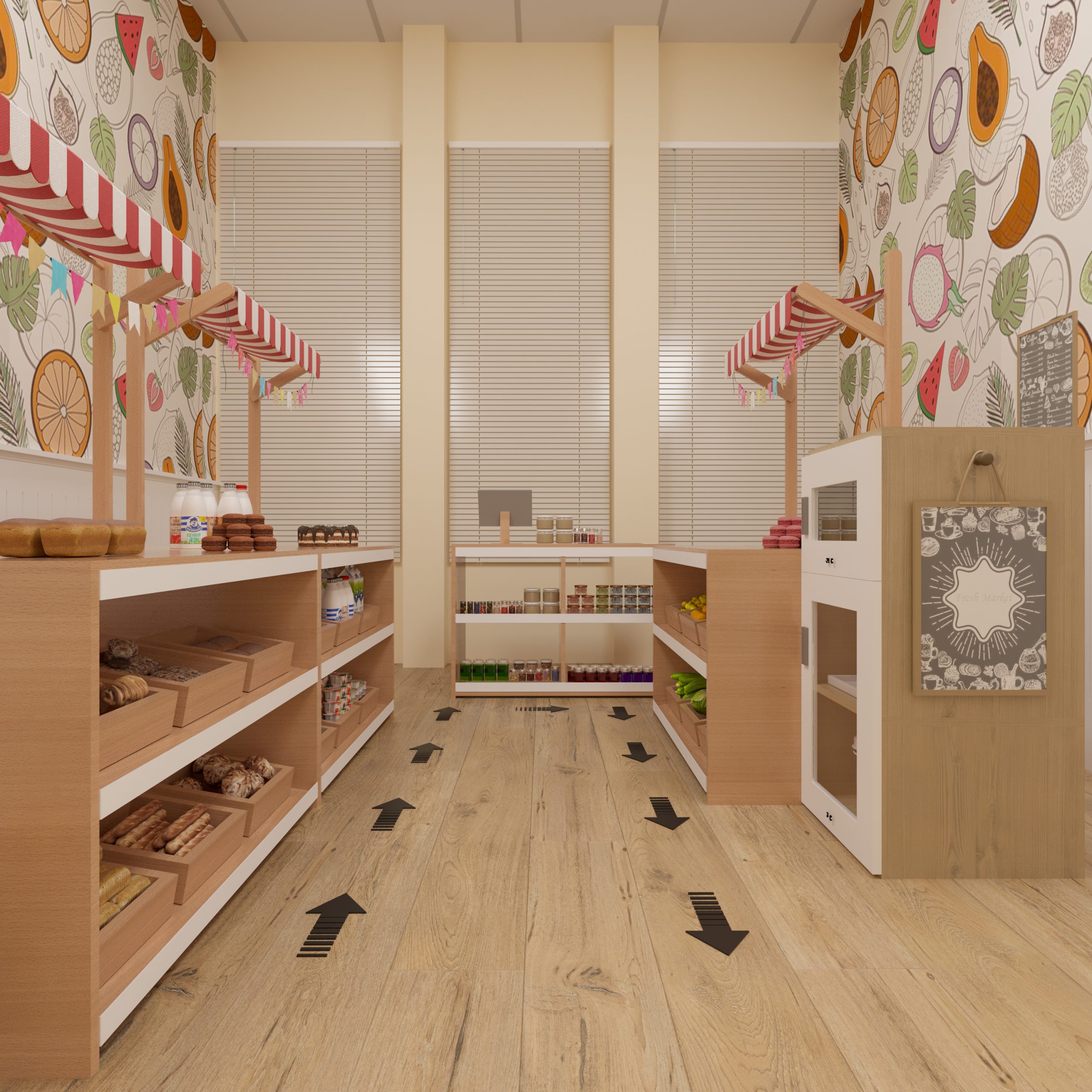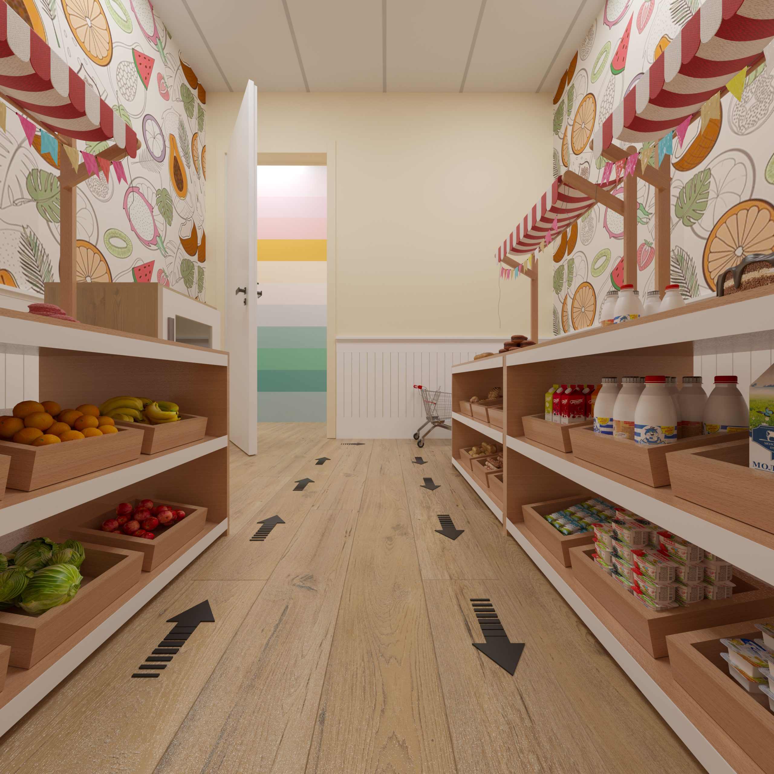 Grocery Room: A miniature grocery store setup provides children with the opportunity for role-play, enhancing social and cognitive development. Play items like shopping carts and shelves make the experience engaging and familiar.