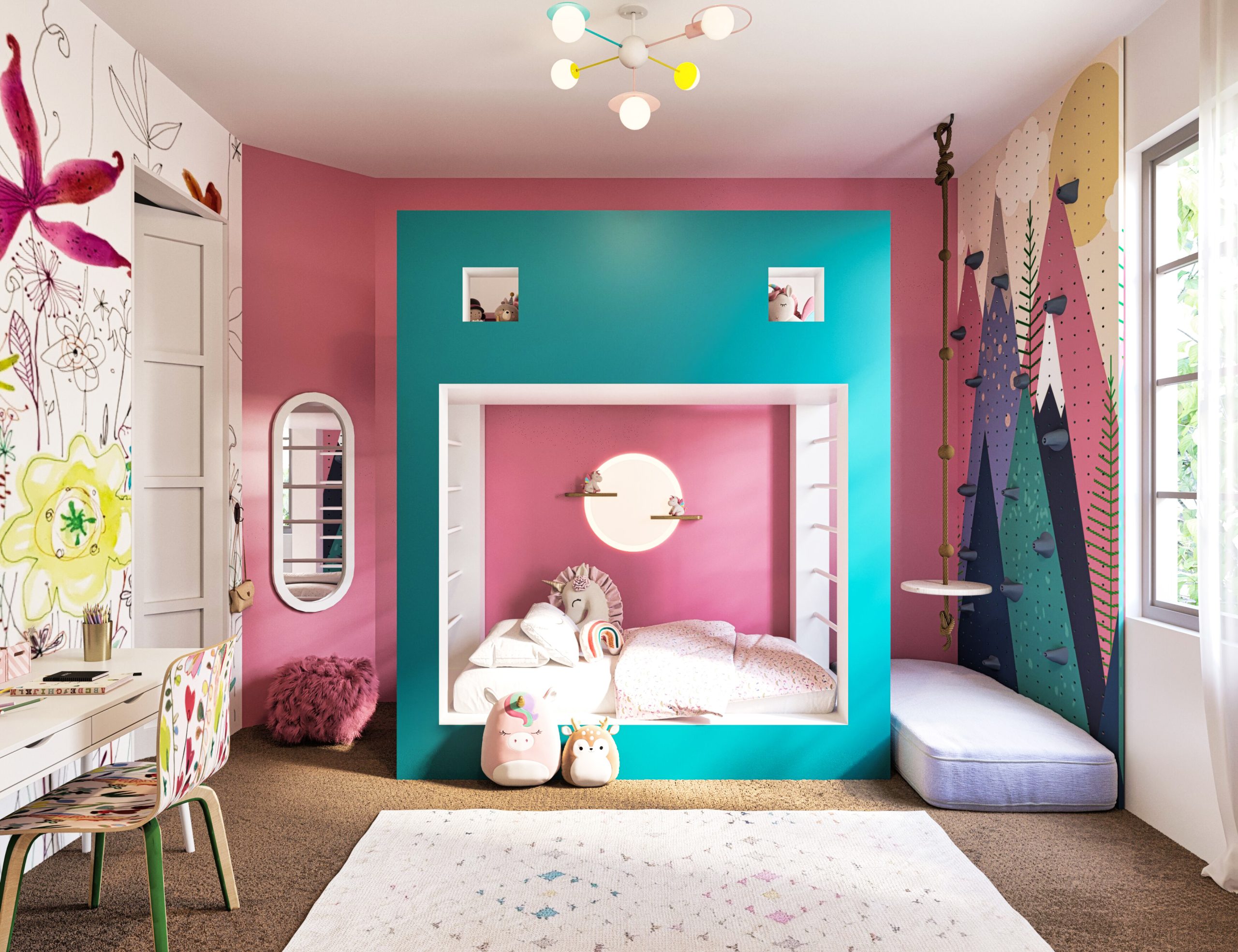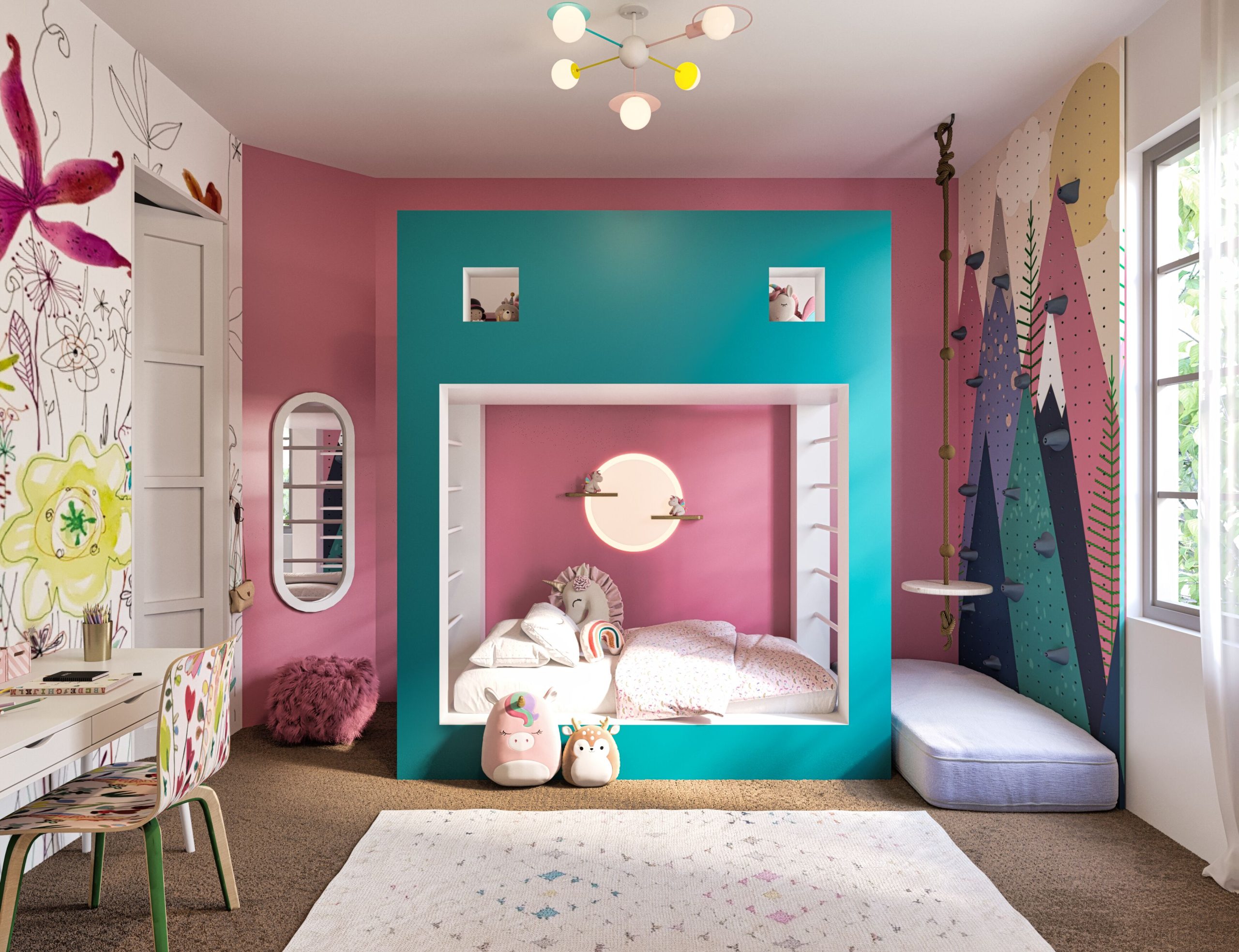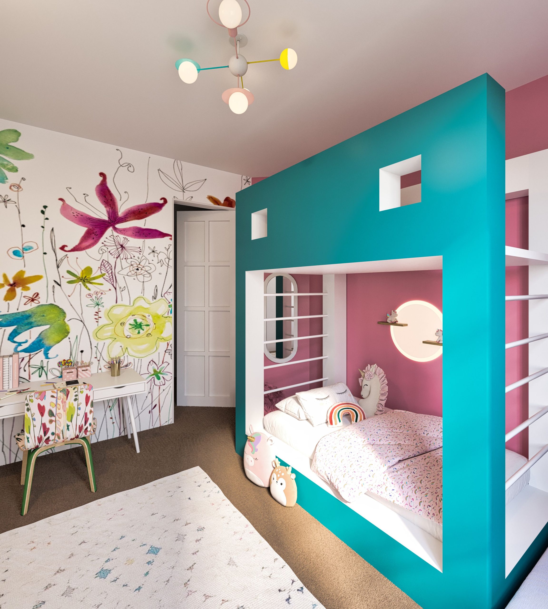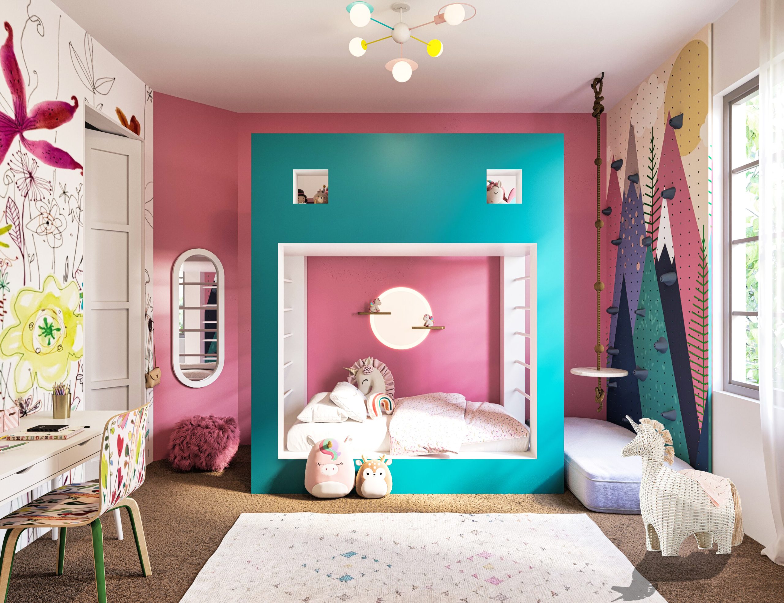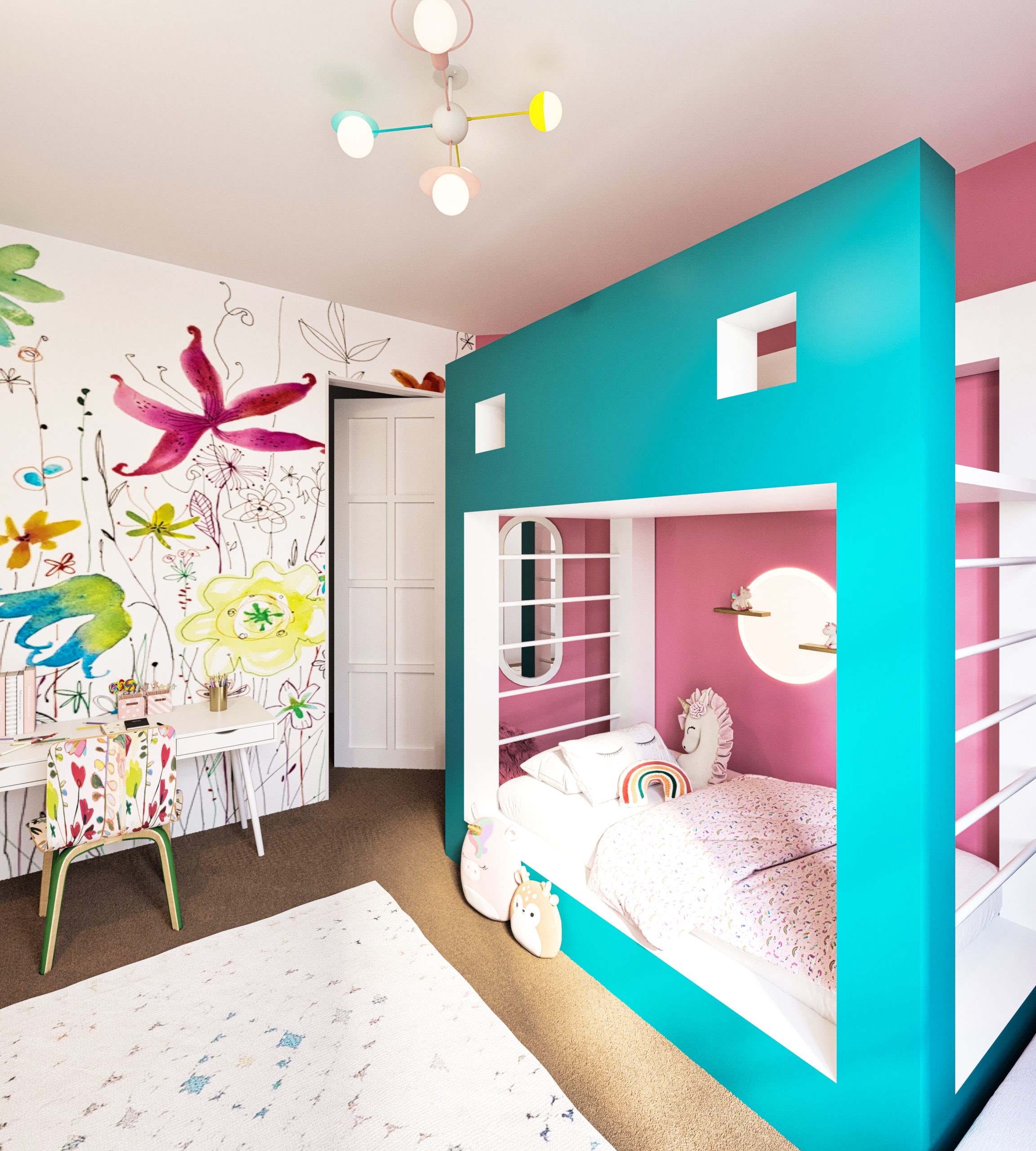 This design concept is tailored for a 6-year-old girl who loves unicorns and teal. A customized bunk bed features a play area on the second level, surrounded by a whimsical castle-inspired design with unicorns. Teal walls and unicorn-themed wallpaper create a magical atmosphere. A matching chair pattern complements the wallpaper, and playful storage solutions keep the room organized. Enchanting accents like fairy lights and unicorn decor complete the delightful space, inviting her into a world of imagination and wonder.
