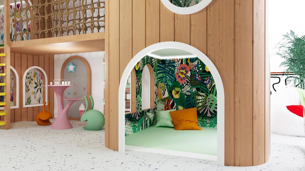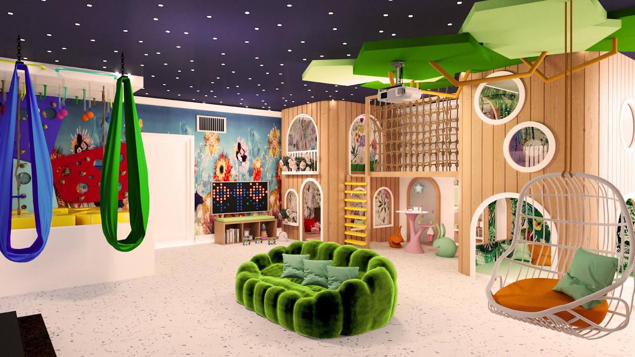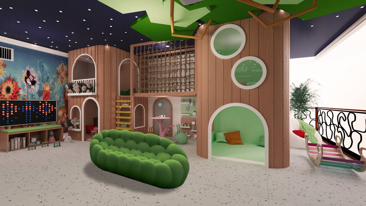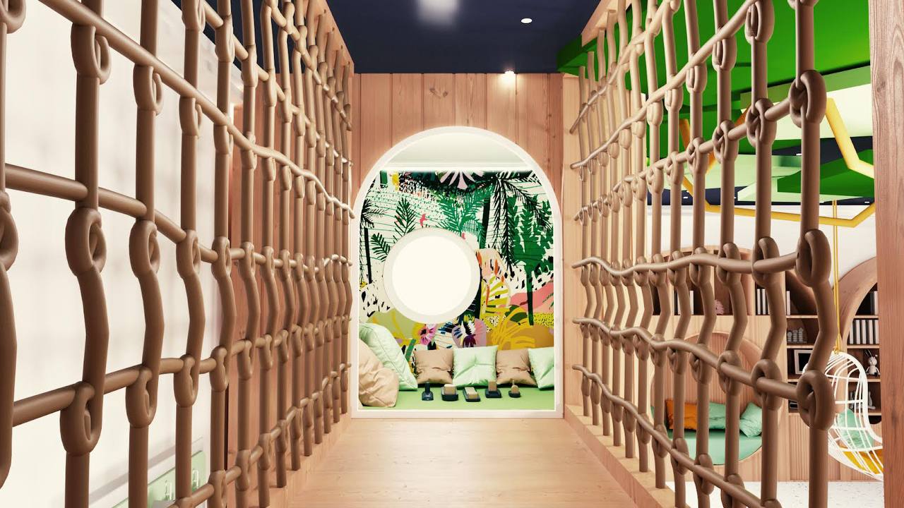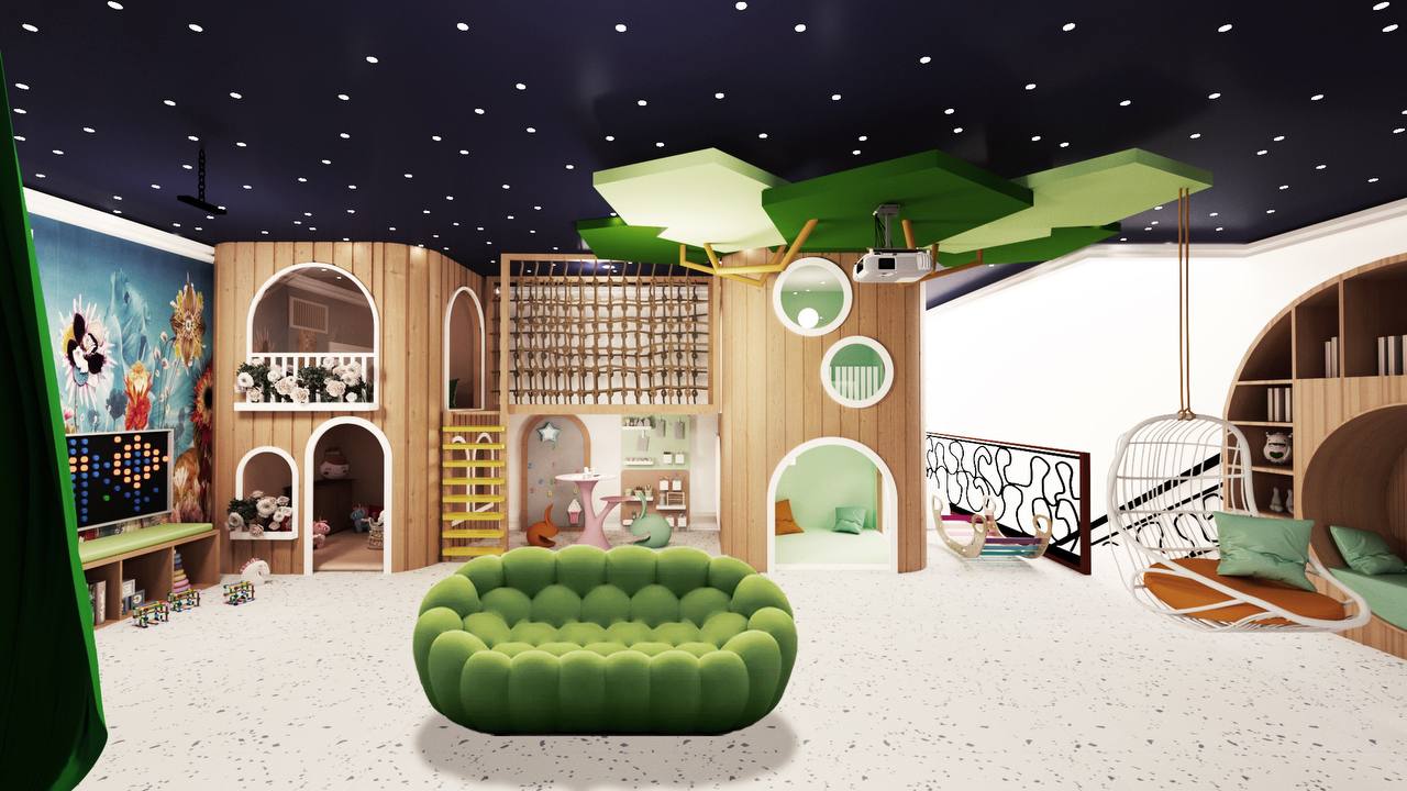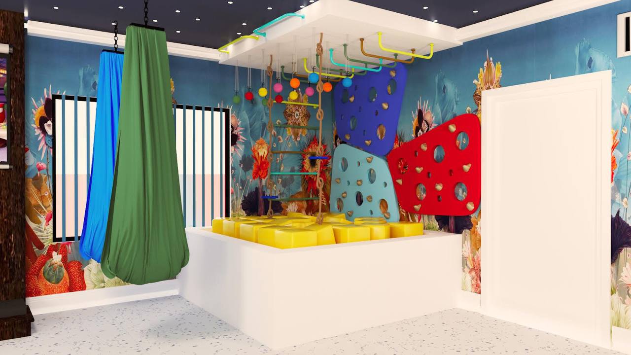 The design integrates a cohesive color palette with pops of vibrant hues to create a playful yet harmonious environment. Soft zones for quieter activities are strategically placed around the play structure, giving children space to rest and recharge between activities. Each element, from the materials to the finishes, is selected for safety, durability, and ease of maintenance, ensuring that the space can withstand active use while remaining inviting and comfortable.