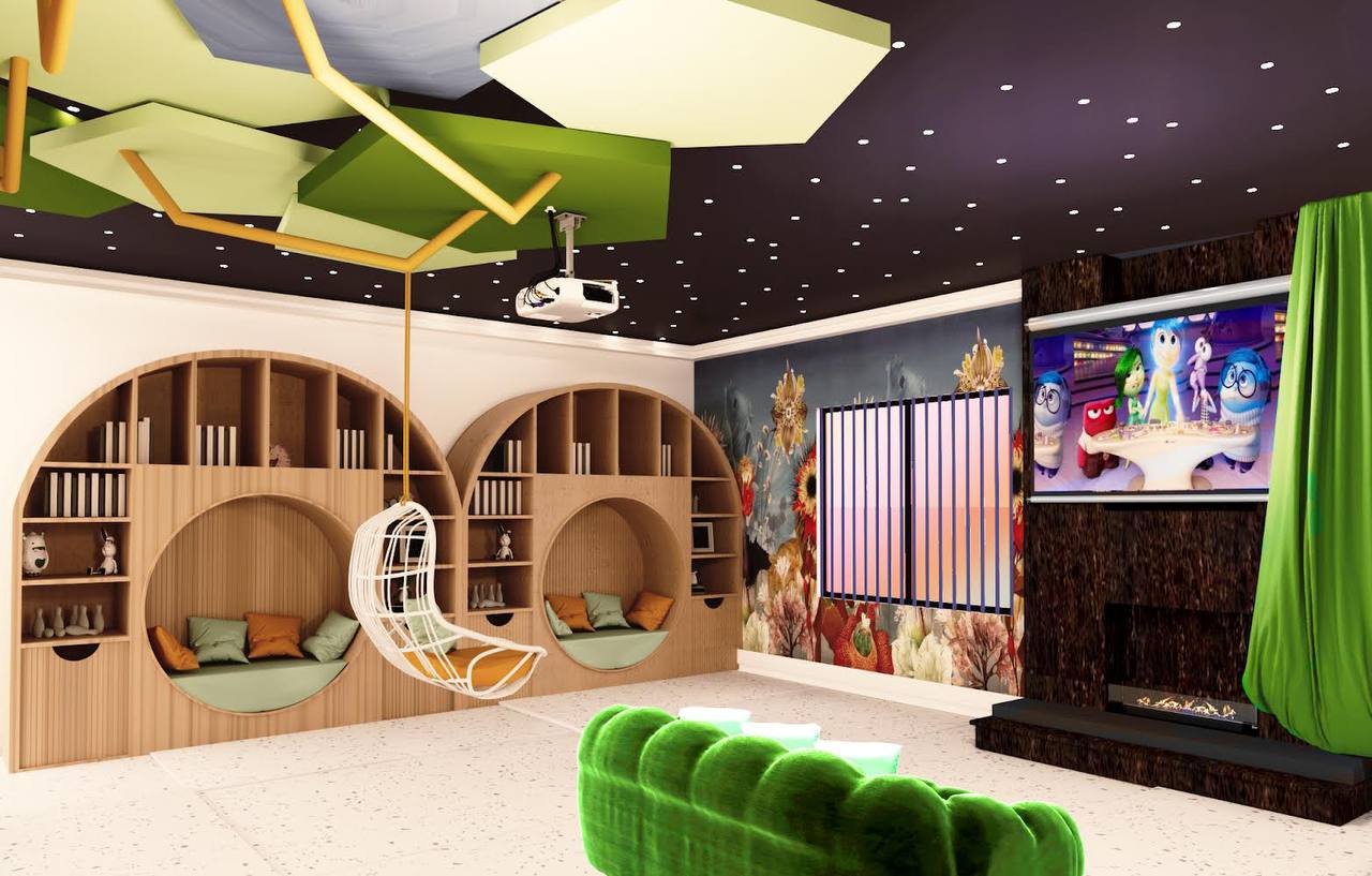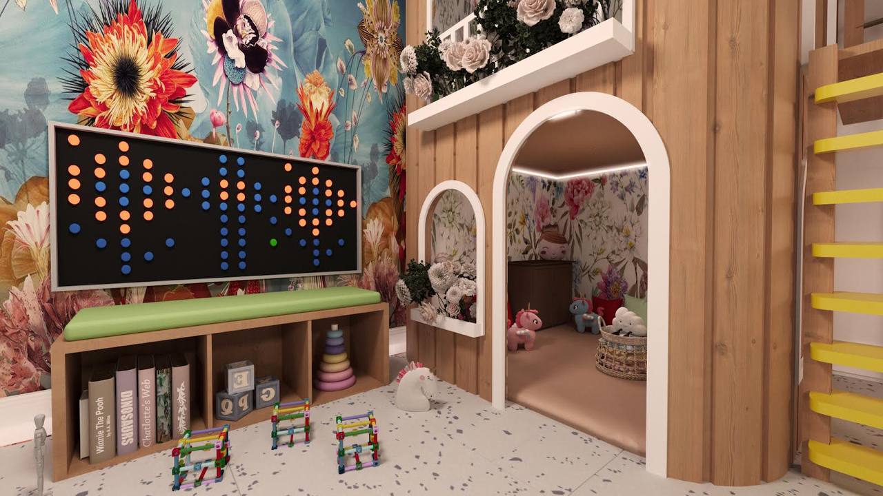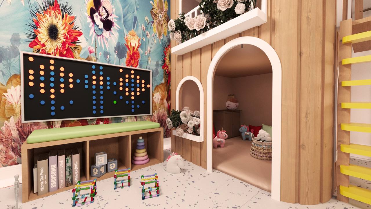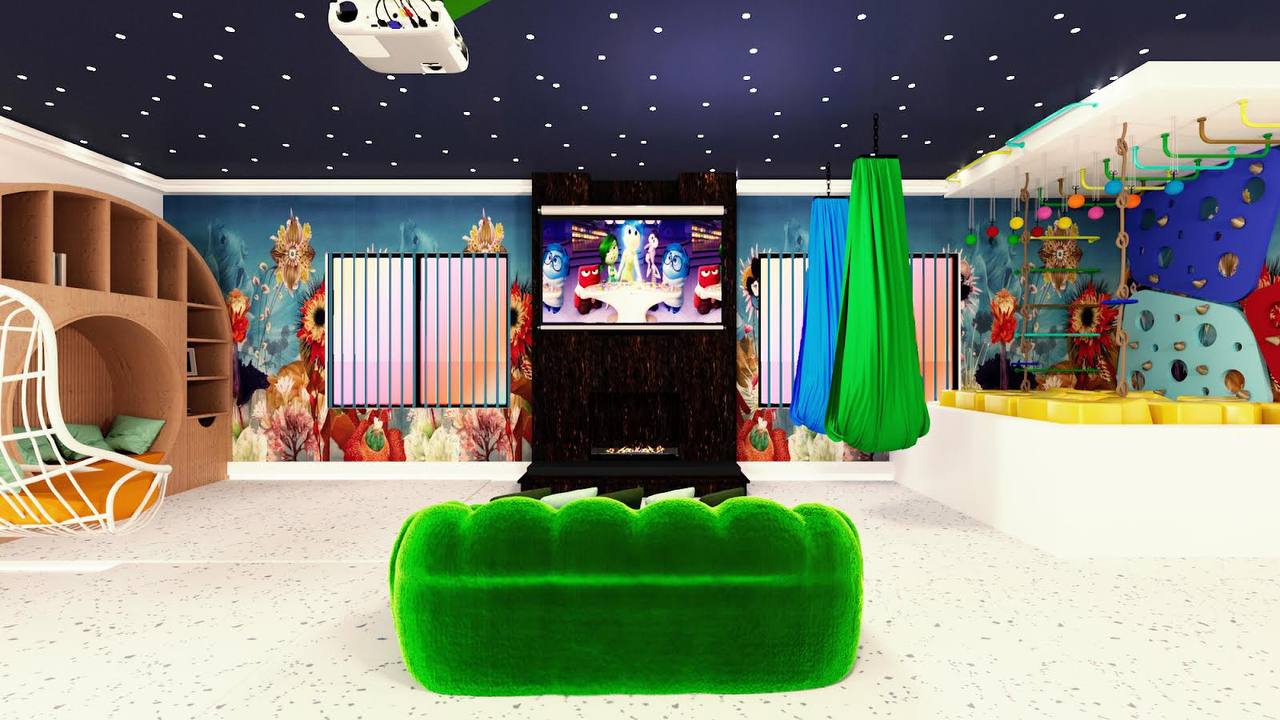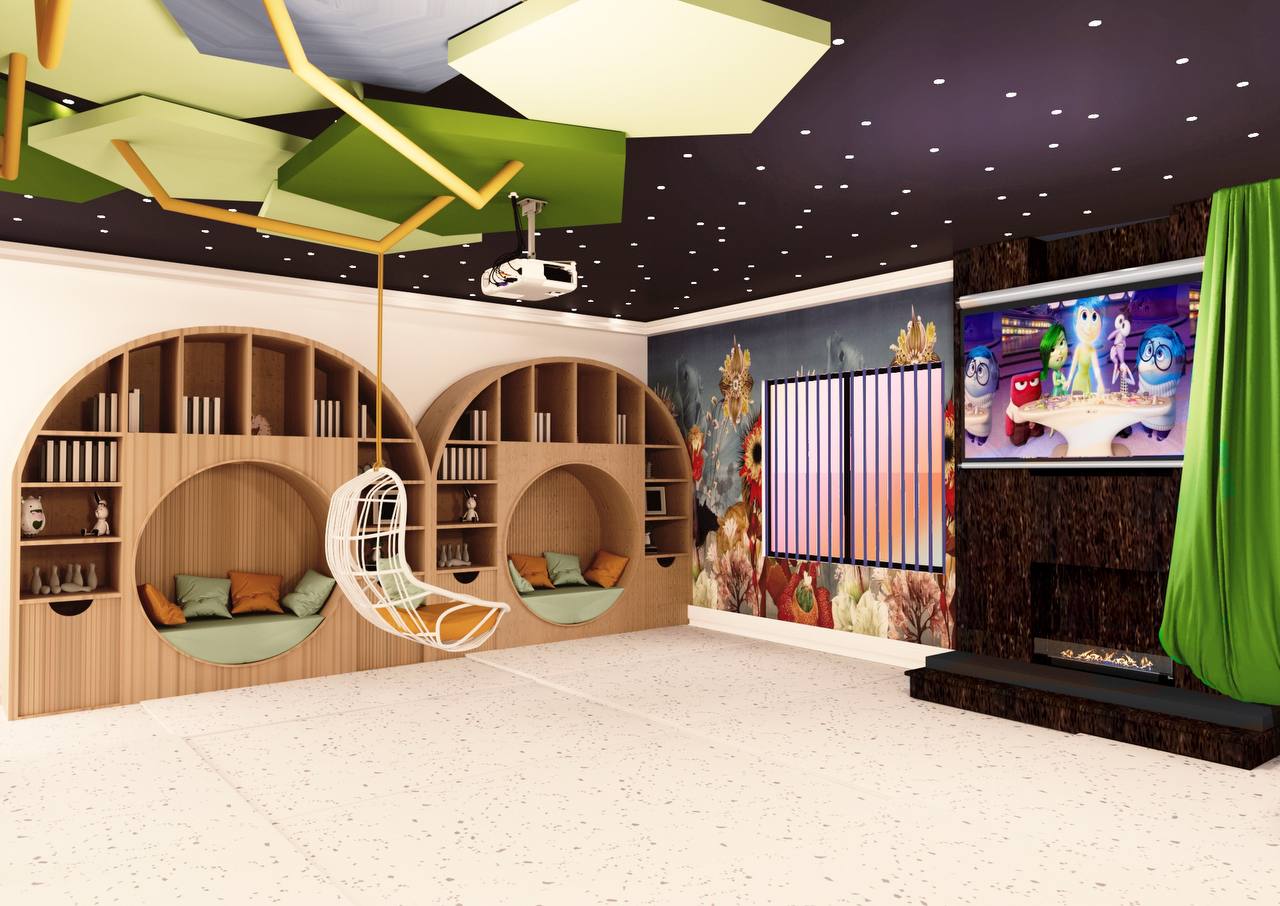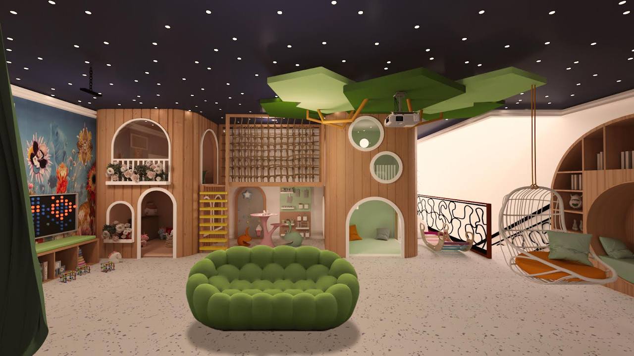 The design integrates a cohesive color palette with pops of vibrant hues to create a playful yet harmonious environment. Soft zones for quieter activities are strategically placed around the play structure, giving children space to rest and recharge between activities. Each element, from the materials to the finishes, is selected for safety, durability, and ease of maintenance, ensuring that the space can withstand active use while remaining inviting and comfortable.