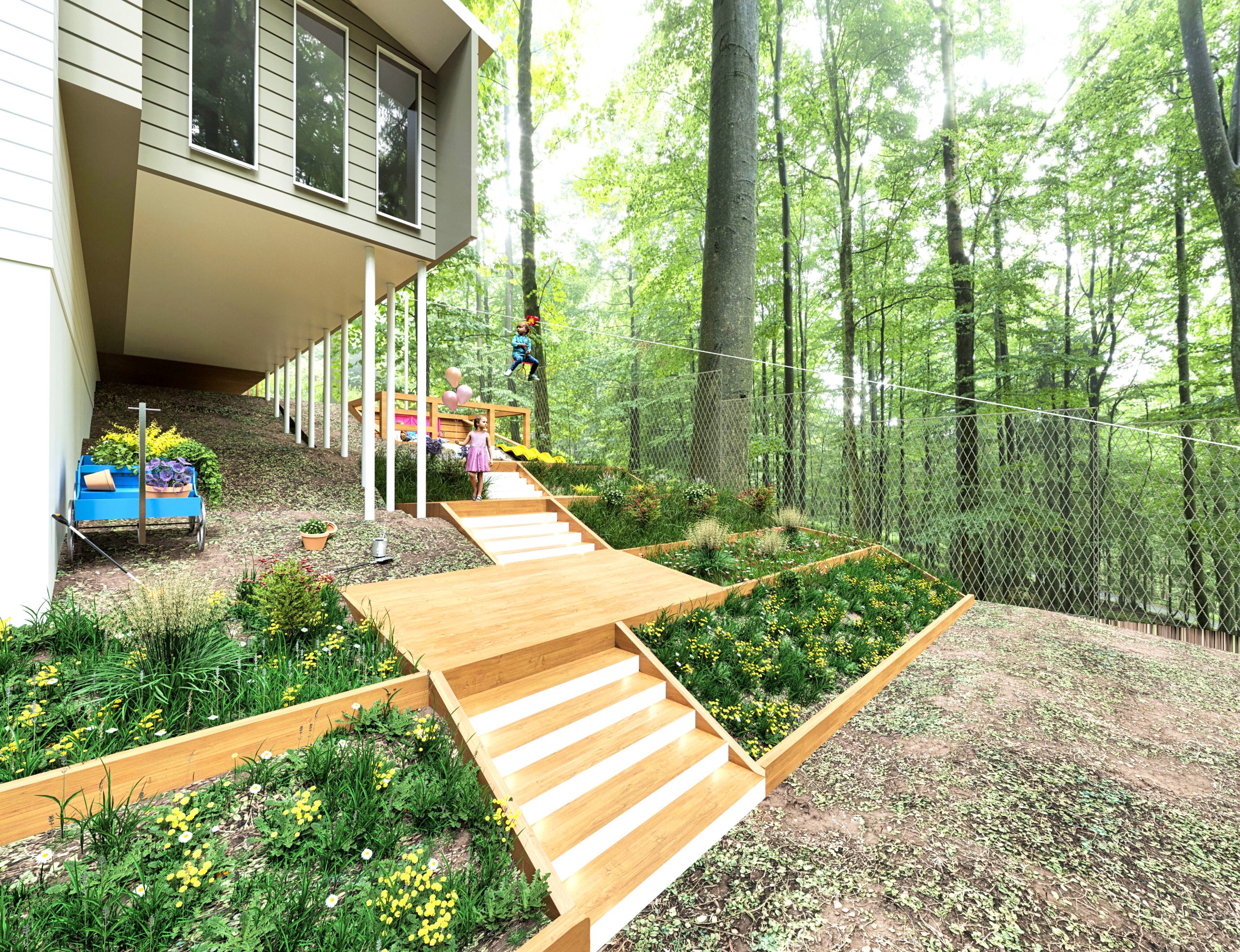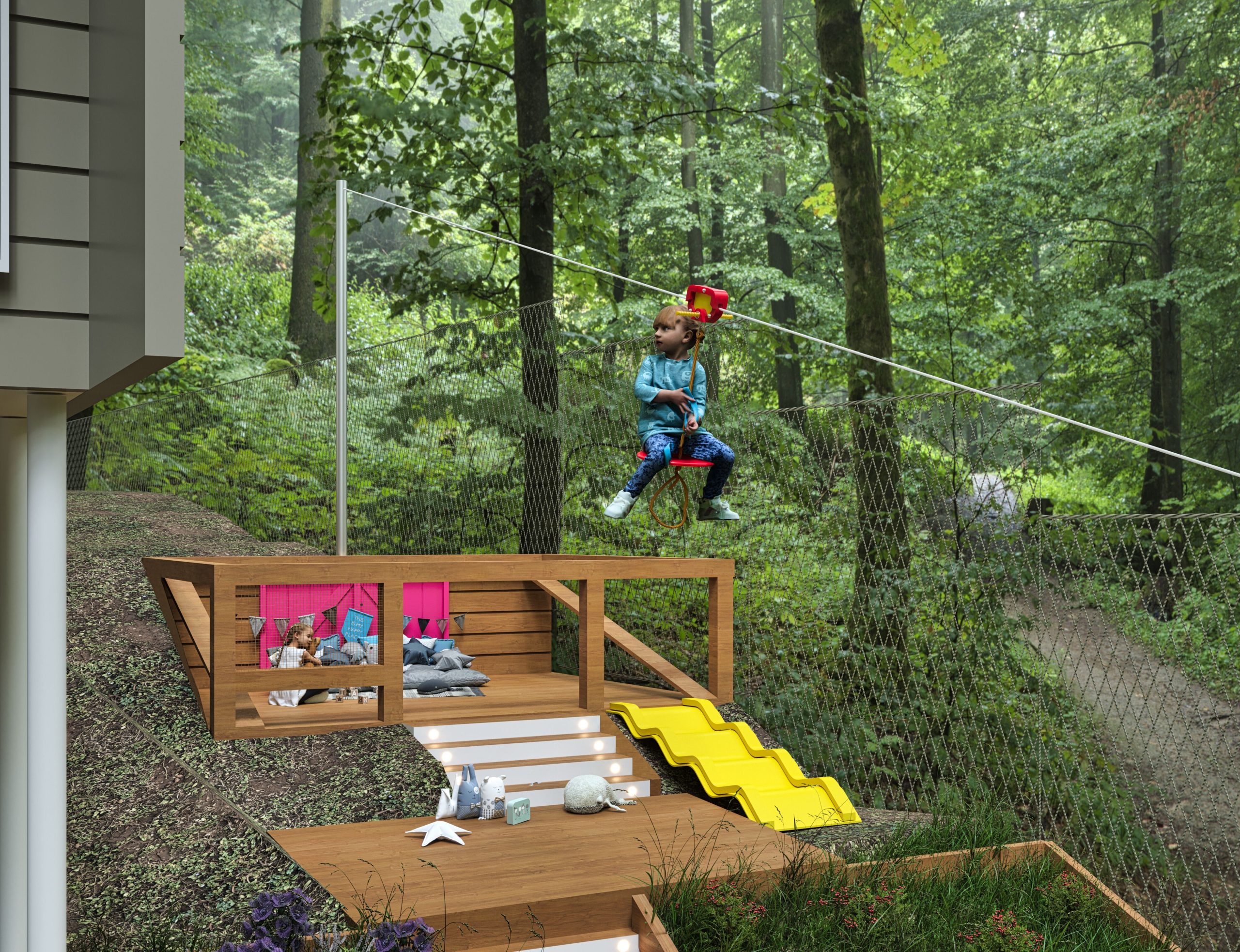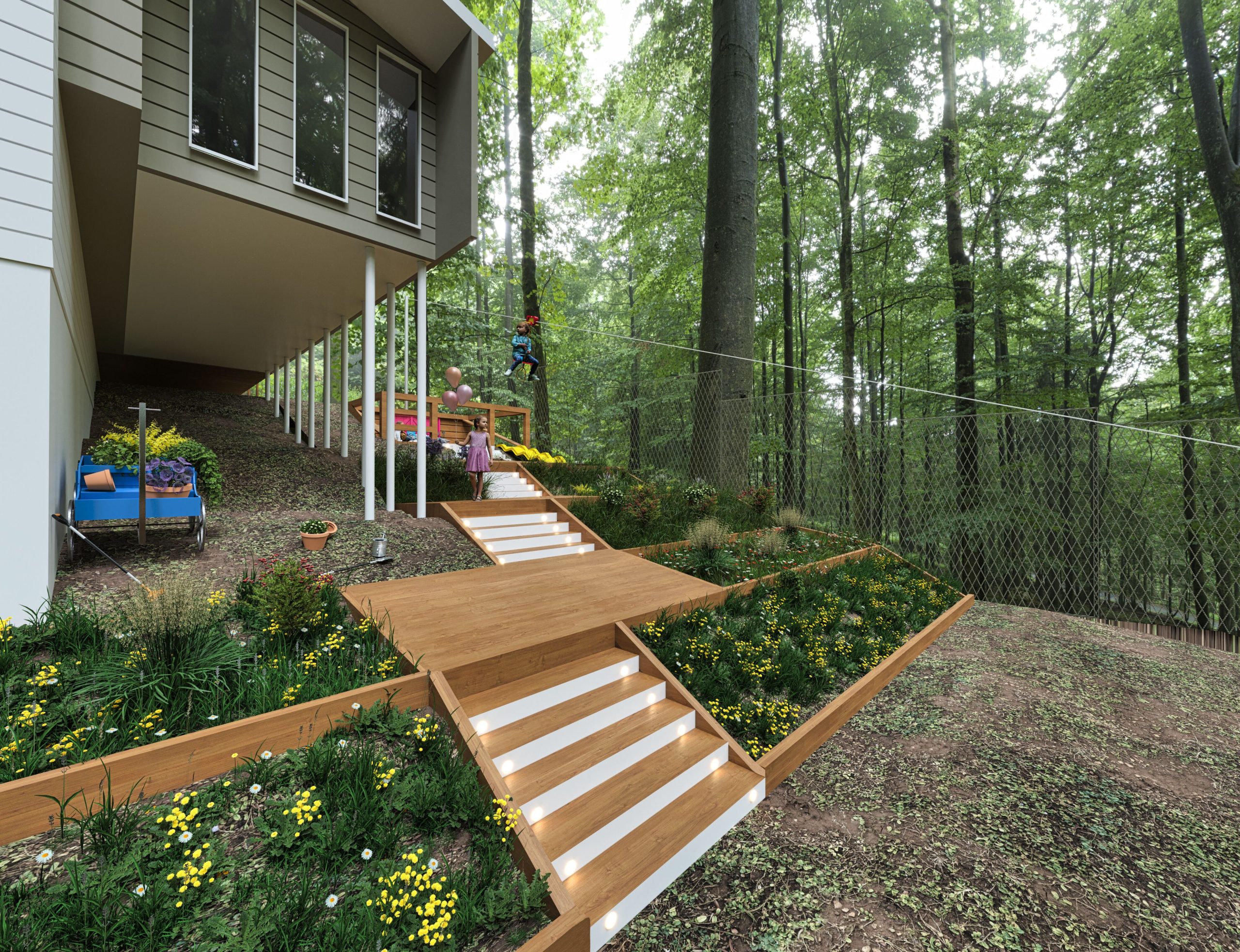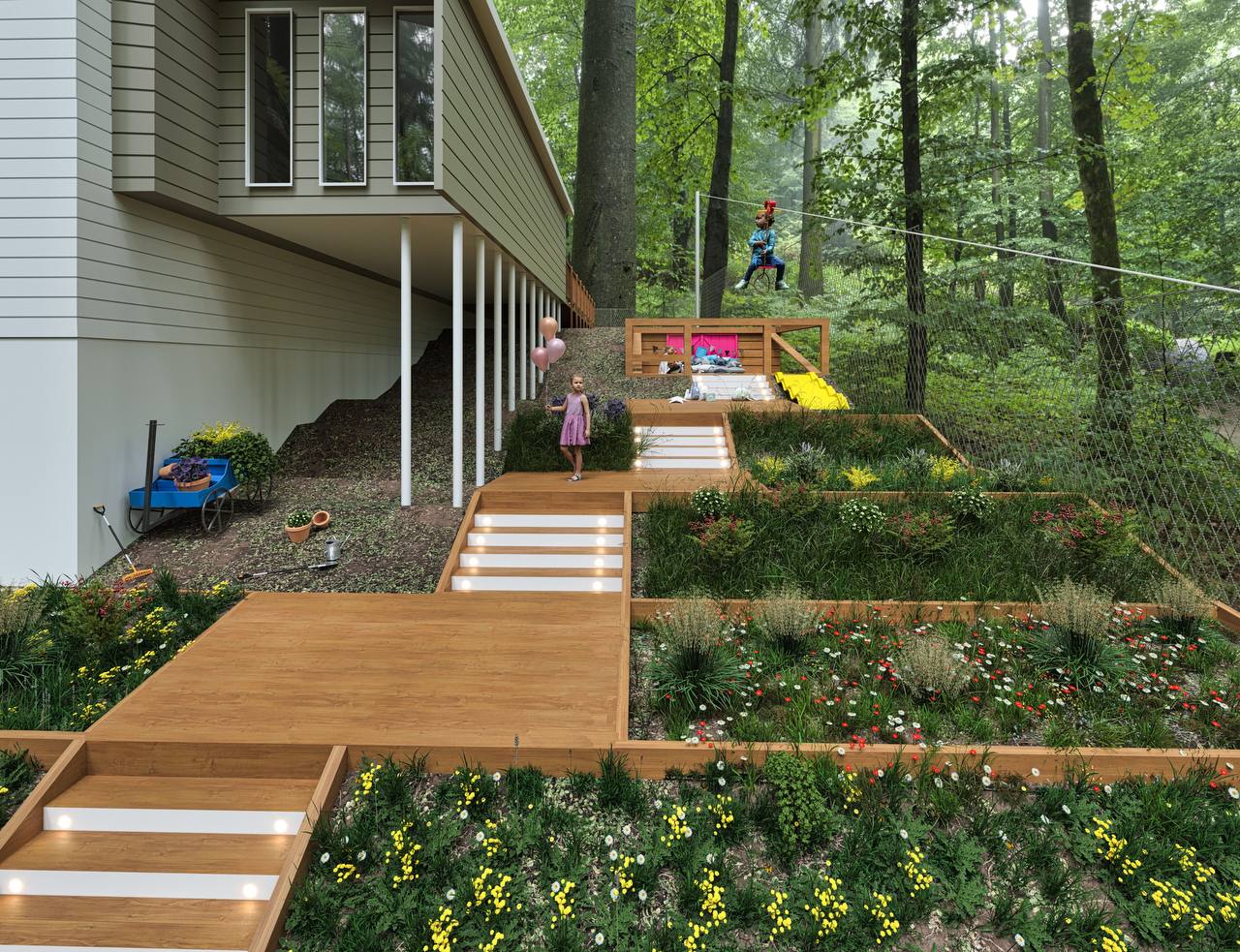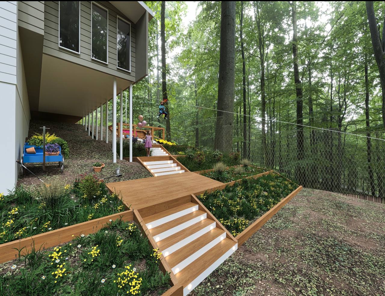 Our goal is to transform a very sloped yard into an exciting and effective play space for kids. By creating different flat stations at various levels, utilizing the slope for a zip line experience, and incorporating play elements throughout, we’ll make the most of the space. At the top is a deck with a slide overlooking the adventure below. The thrilling zip line will whisk kids from the deck to a landing zone below. There is a climbing wall, and swings will encourage active play. Safety and accessibility will be prioritized, ensuring a fun and secure environment. The play story will flow effortlessly, sparking joy and unforgettable memories in this multi-tiered adventure yard.