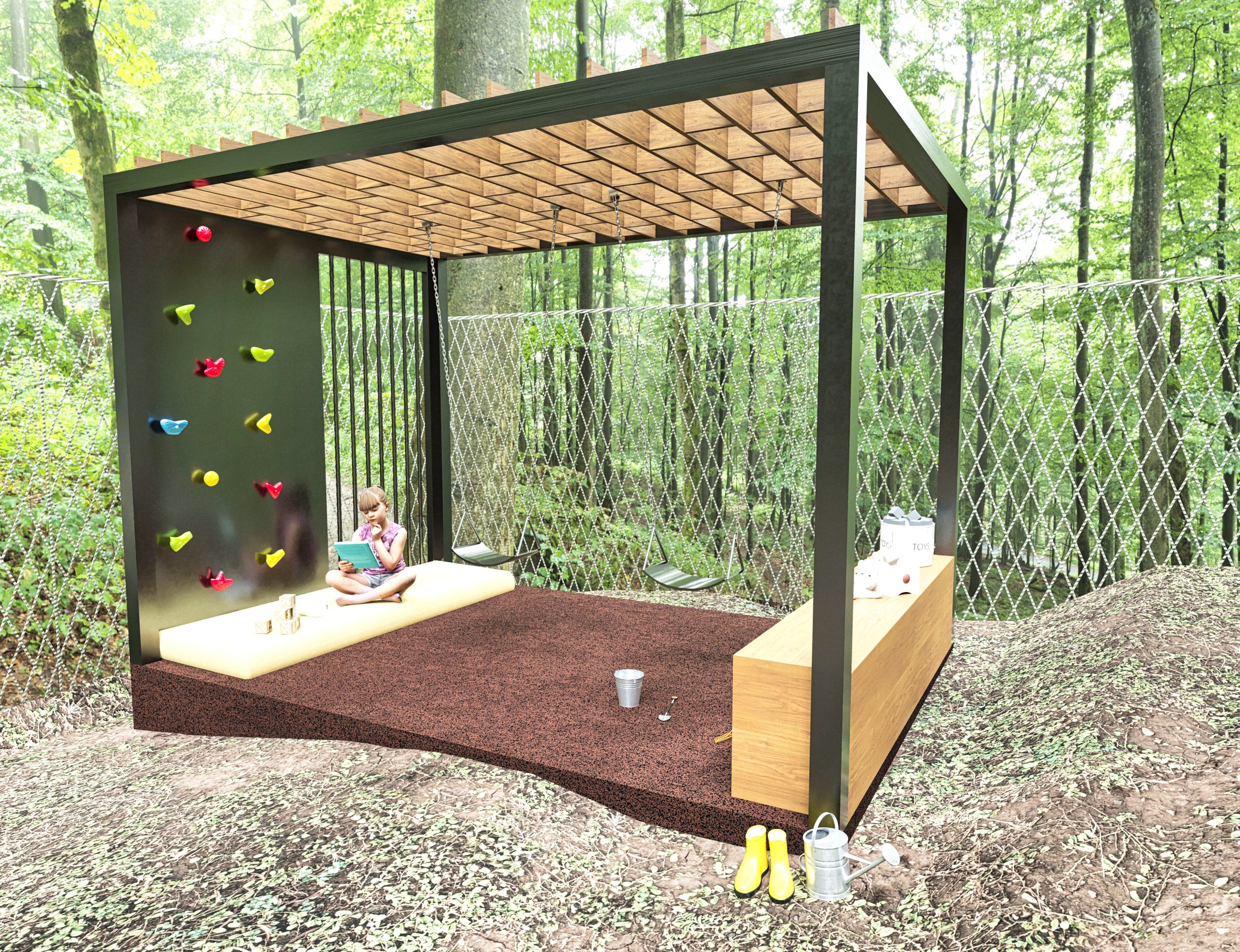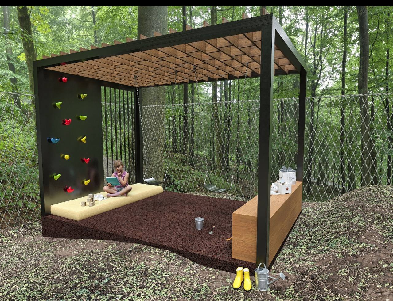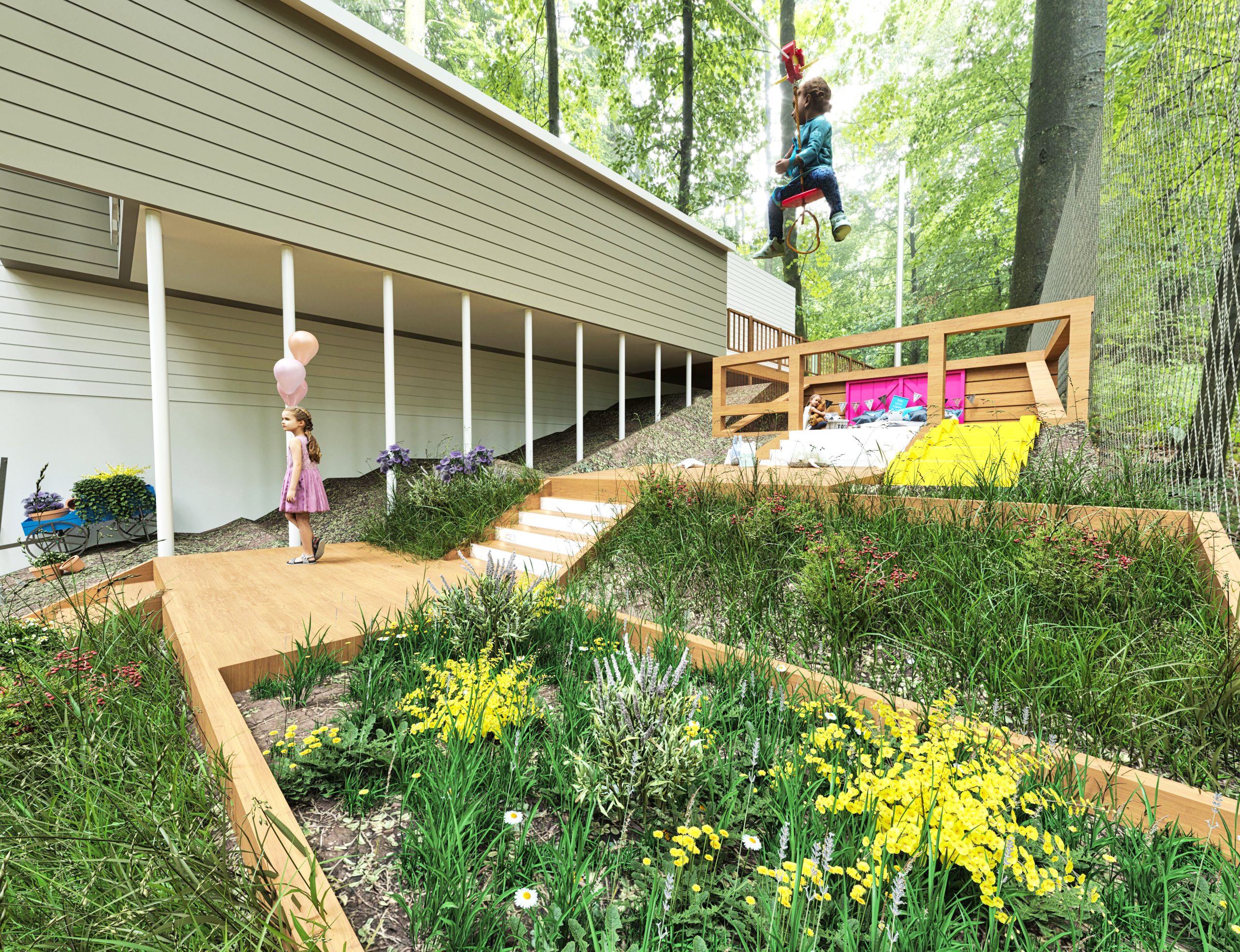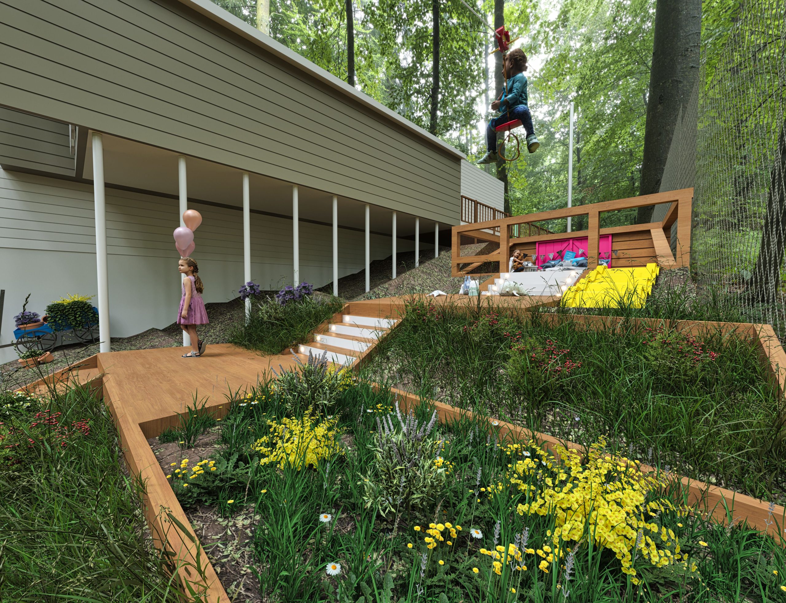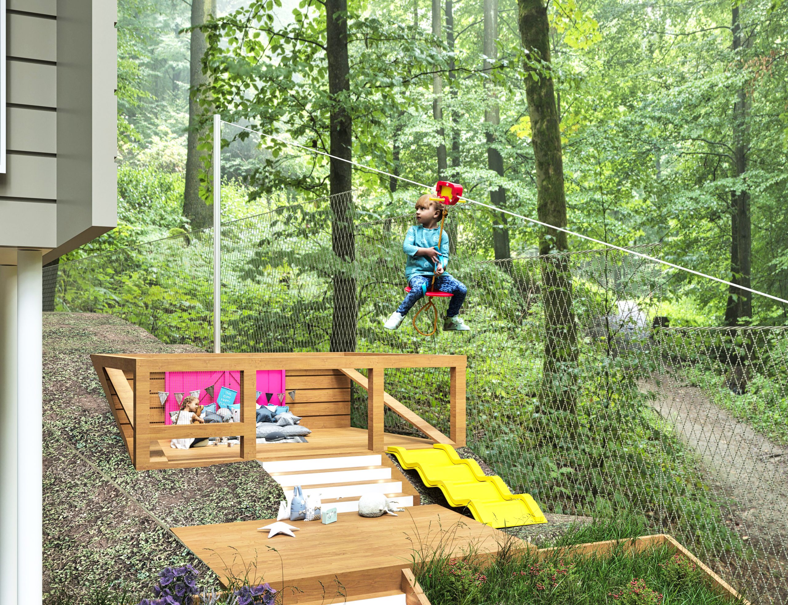 Our goal is to transform a very sloped yard into an exciting and effective play space for kids. By creating different flat stations at various levels, utilizing the slope for a zip line experience, and incorporating play elements throughout, we’ll make the most of the space. At the top is a deck with a slide overlooking the adventure below. The thrilling zip line will whisk kids from the deck to a landing zone below. There is a climbing wall, and swings will encourage active play. Safety and accessibility will be prioritized, ensuring a fun and secure environment. The play story will flow effortlessly, sparking joy and unforgettable memories in this multi-tiered adventure yard.